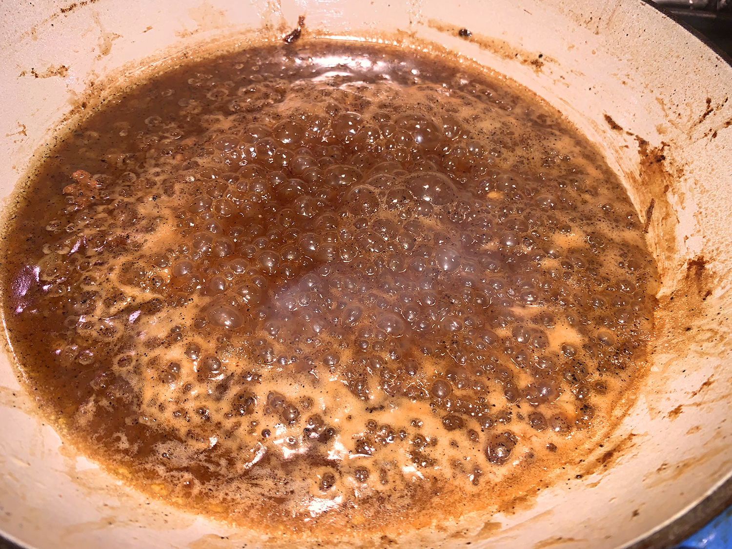 - Add wine; simmer until reduced by half, scraping browned bits from pan bottom with wooden spoon, 2 to 3 minutes.