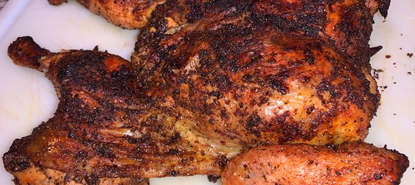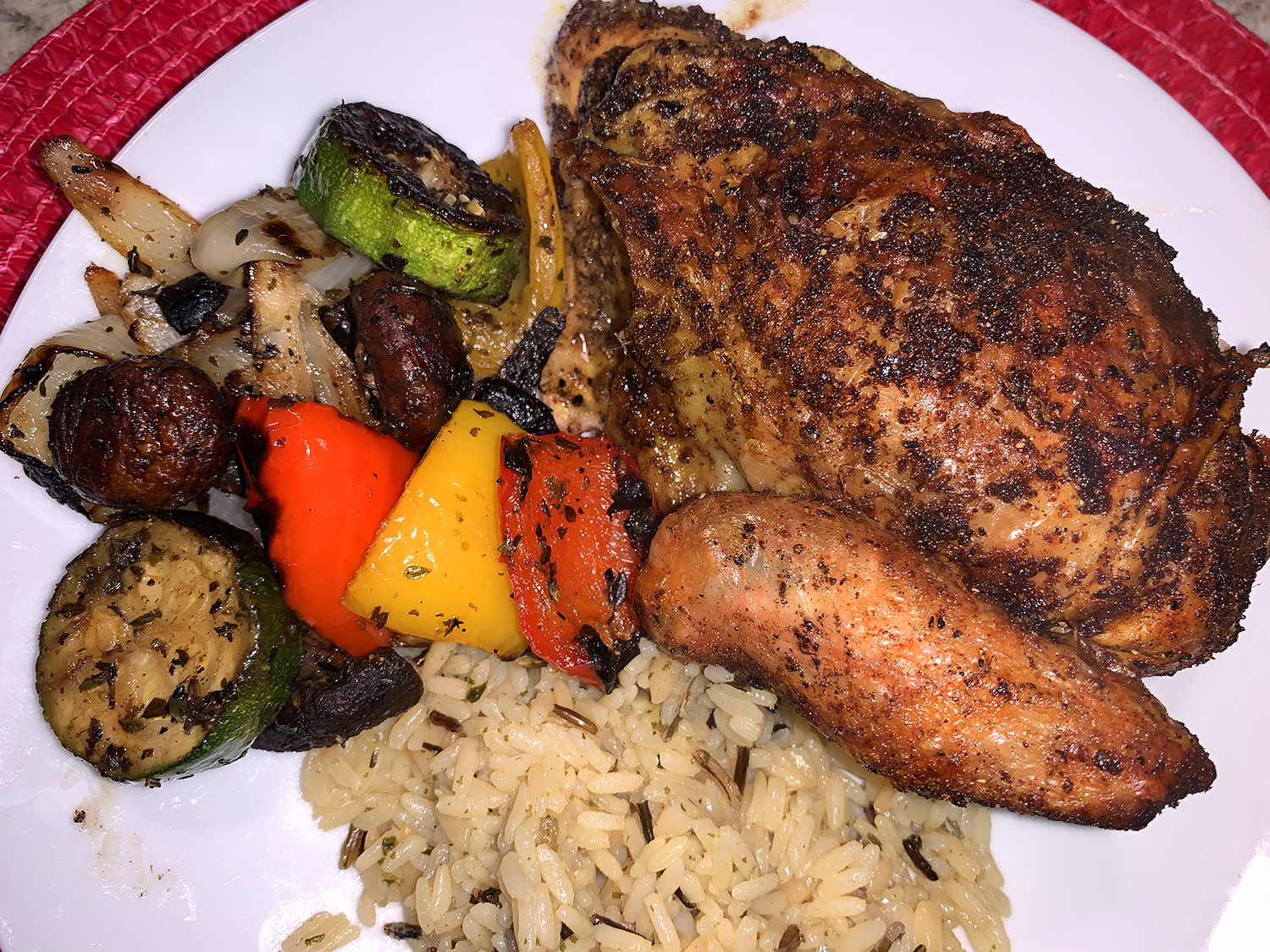 If you reside in the camp of bold flavors, then this bird is calling your name. Not only does it smell and taste wonderful, but the meat remains juicy while the skin gets nice and crispy. We paired ours with mixed vegetables that were grilled alongside the chicken, and an easy boxed rice dish. Some stores even sell the chicken already spatchcocked, but we prefer to buy it whole so that the extra parts can go into our poultry “body bag” and used to make stock.