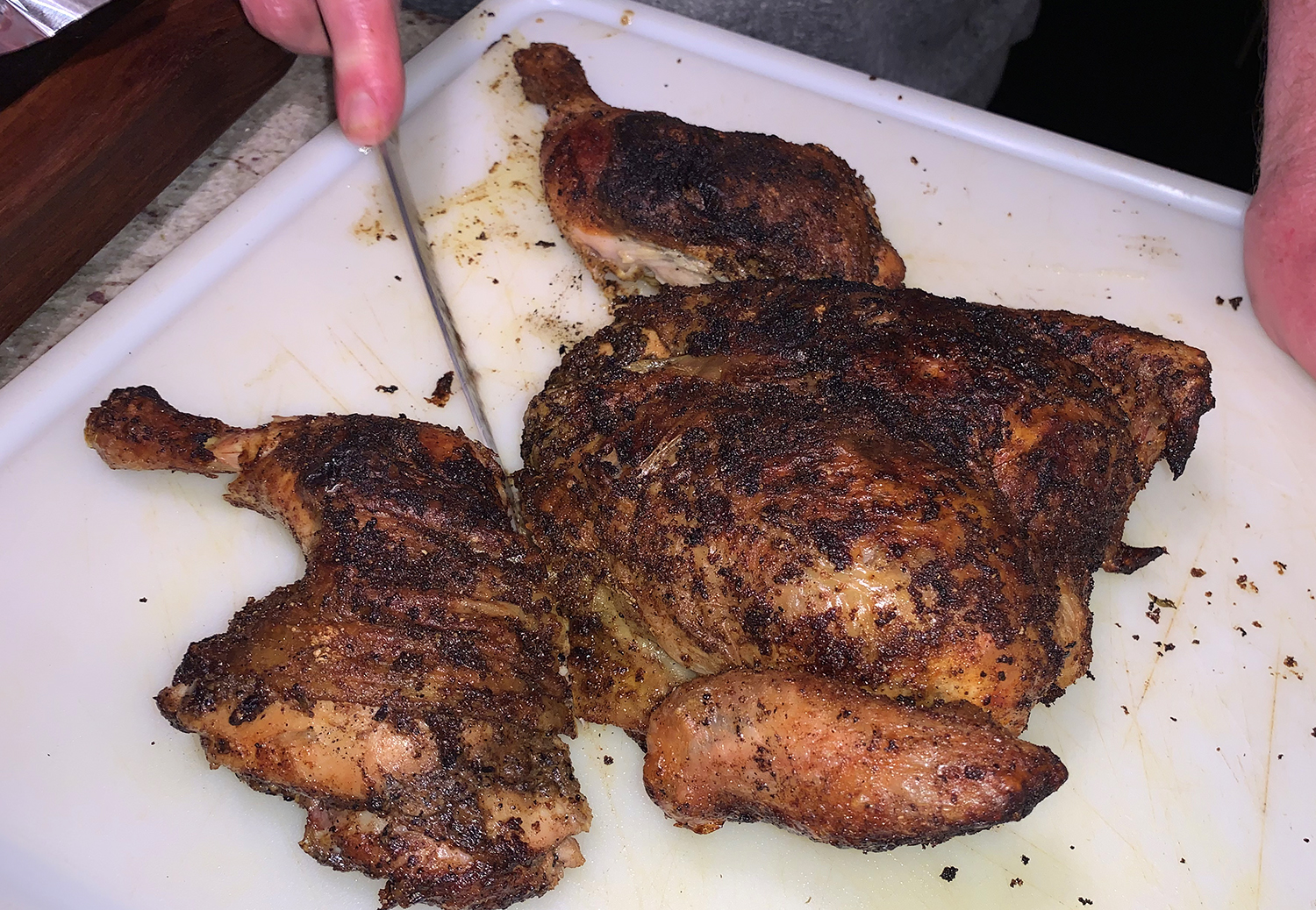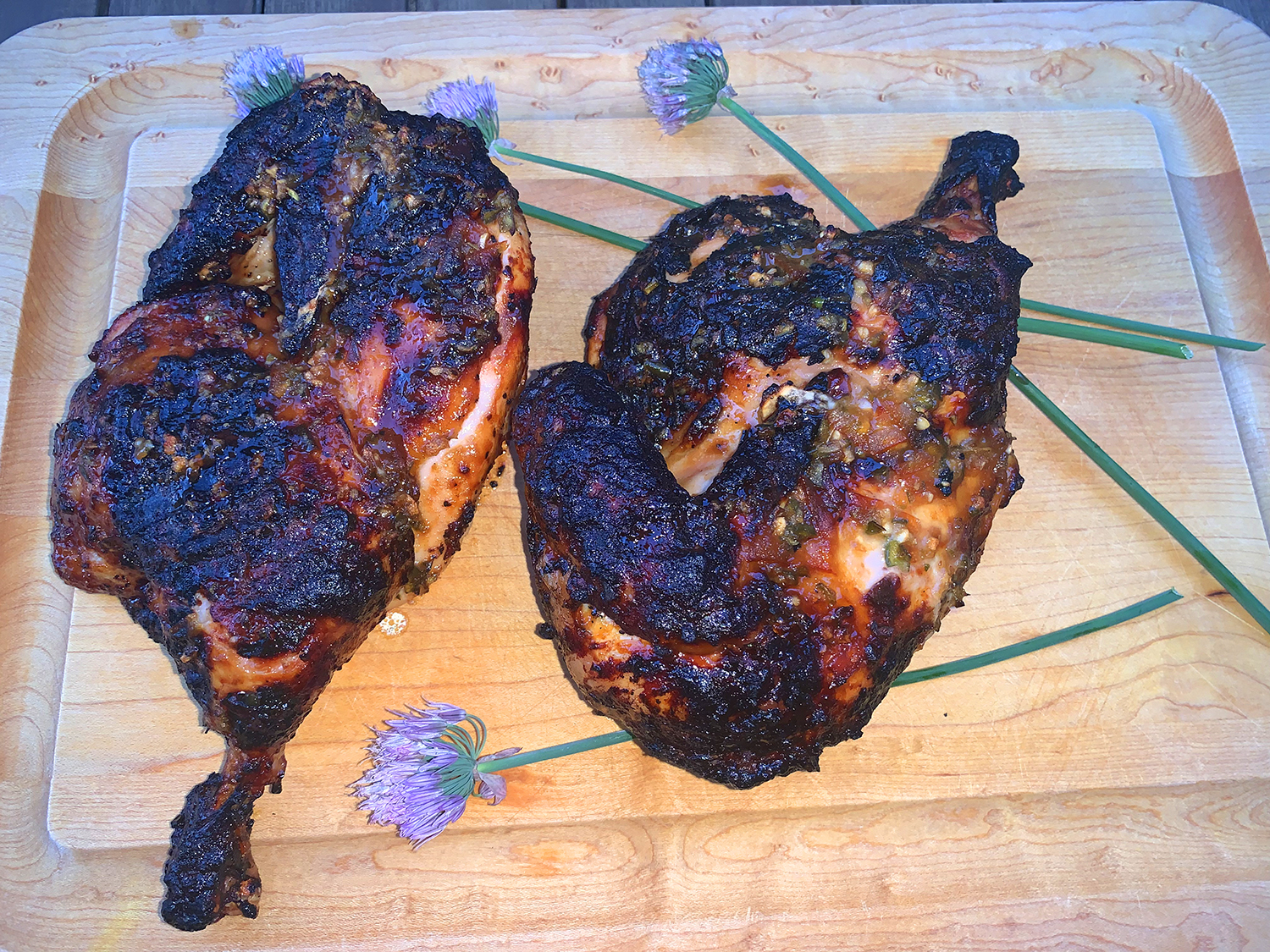 Spatchcocked and grilled, the bird cooks in under an hour and is rich and complexly flavored, with smokiness from the grill. (If you’re using charcoal, don’t forget to open the grill vents, both on the bottom of the grill and on the lid. This is will allow airflow so the fire does not extinguish during the covered cooking time.)