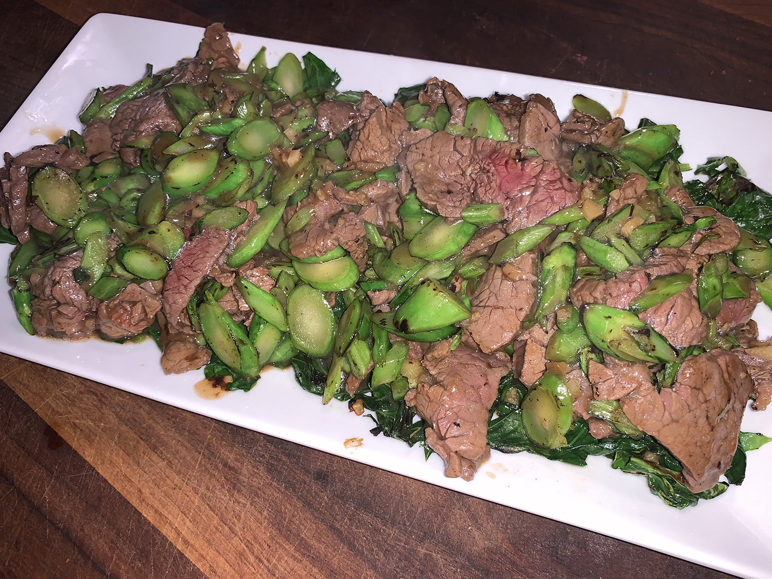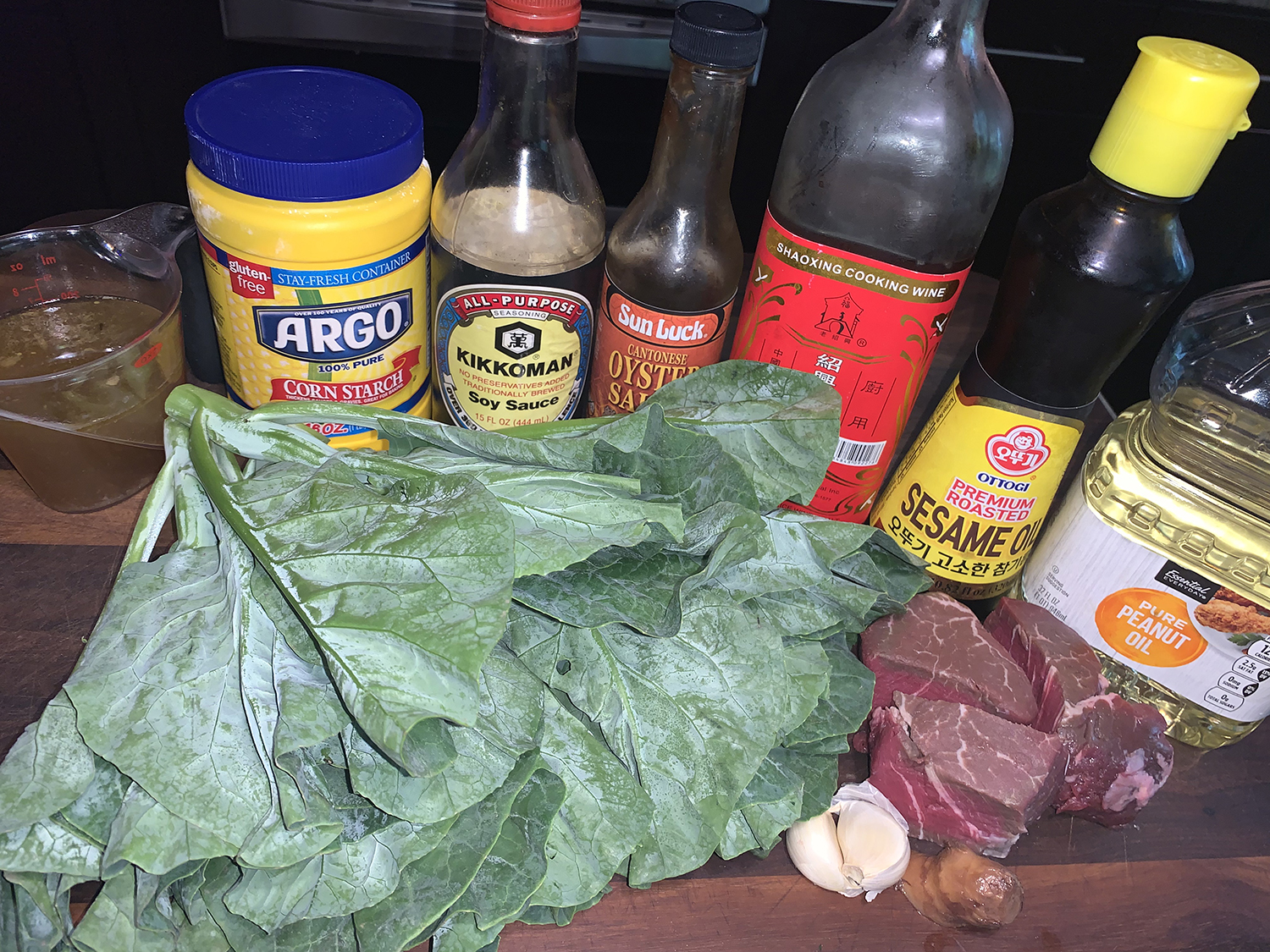 Finally, stir-fry the marinated beef; returned the stalks to the wok; and stir in a blend of chicken broth, oyster sauce, soy sauce, Shaoxing wine, toasted sesame oil, and cornstarch. The sauce thickens in less than a minute. Arrange the beef mixture over the leaves, ensuring that each bite is perfectly sauced. If desired, serve with steamed rice.