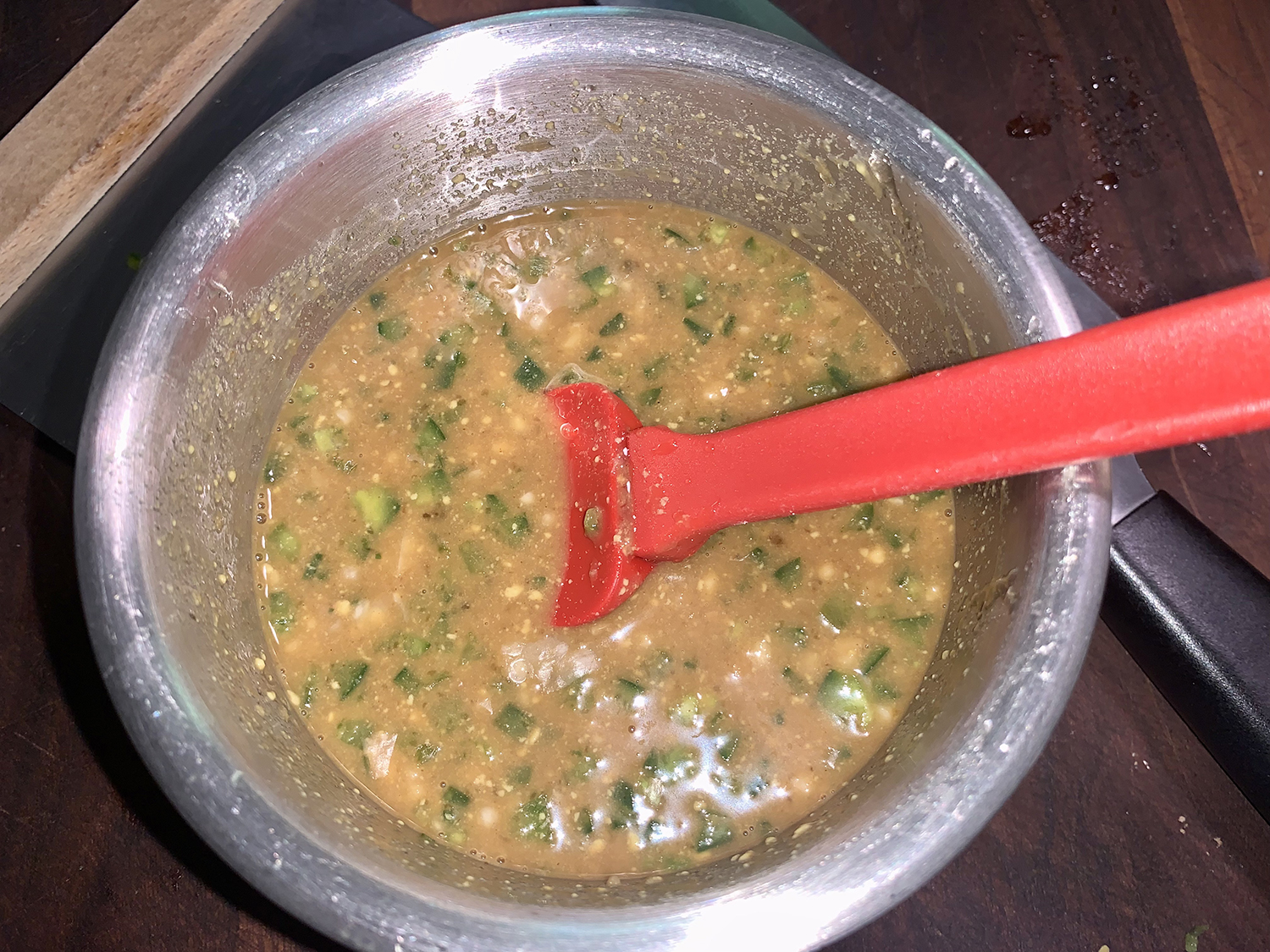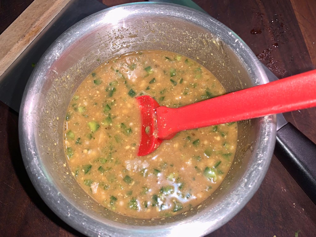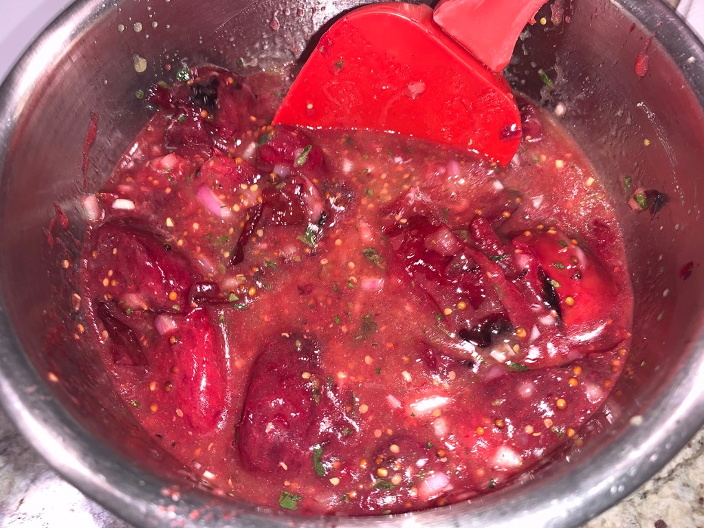 When it comes to hosting, we like to do as much as possible the day prior to the event. For this side dish, he blackened and peeled the tomatoes and bell peppers, then salted the peeled cucumber slices. About half an hour before the feast was served, the salad was finished with the dressing.