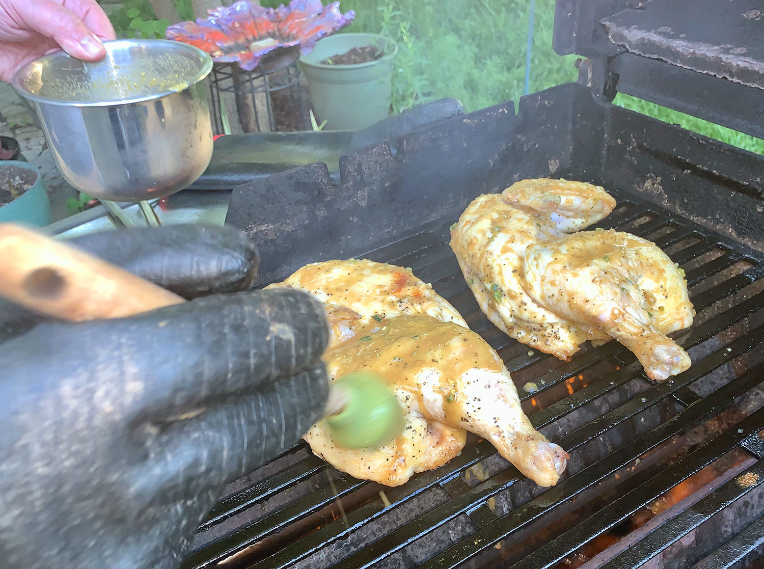 For the tangy glaze, stir up a few condiment powerhouses like marmalade, Dijon mustard, and sherry vinegar, and brush them onto the chicken after cooking it most of the way through, covered over indirect heat. For the final 10 to 15 minutes, transfer the chicken halves to direct heat and baste with every flip until glistening and charred. Leftover glaze can be cooked down as a sauce to serve alongside the finished dish.