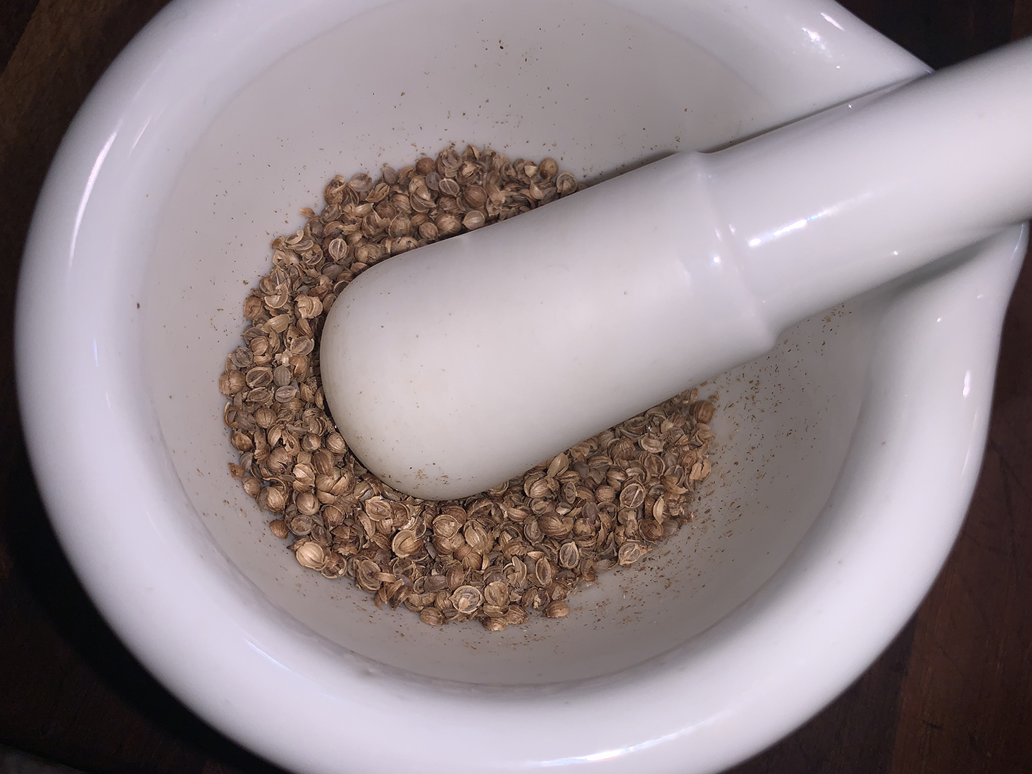 In a small bowl, stir together the coriander, garlic, zest and 1/4 teaspoon each of salt and pepper.