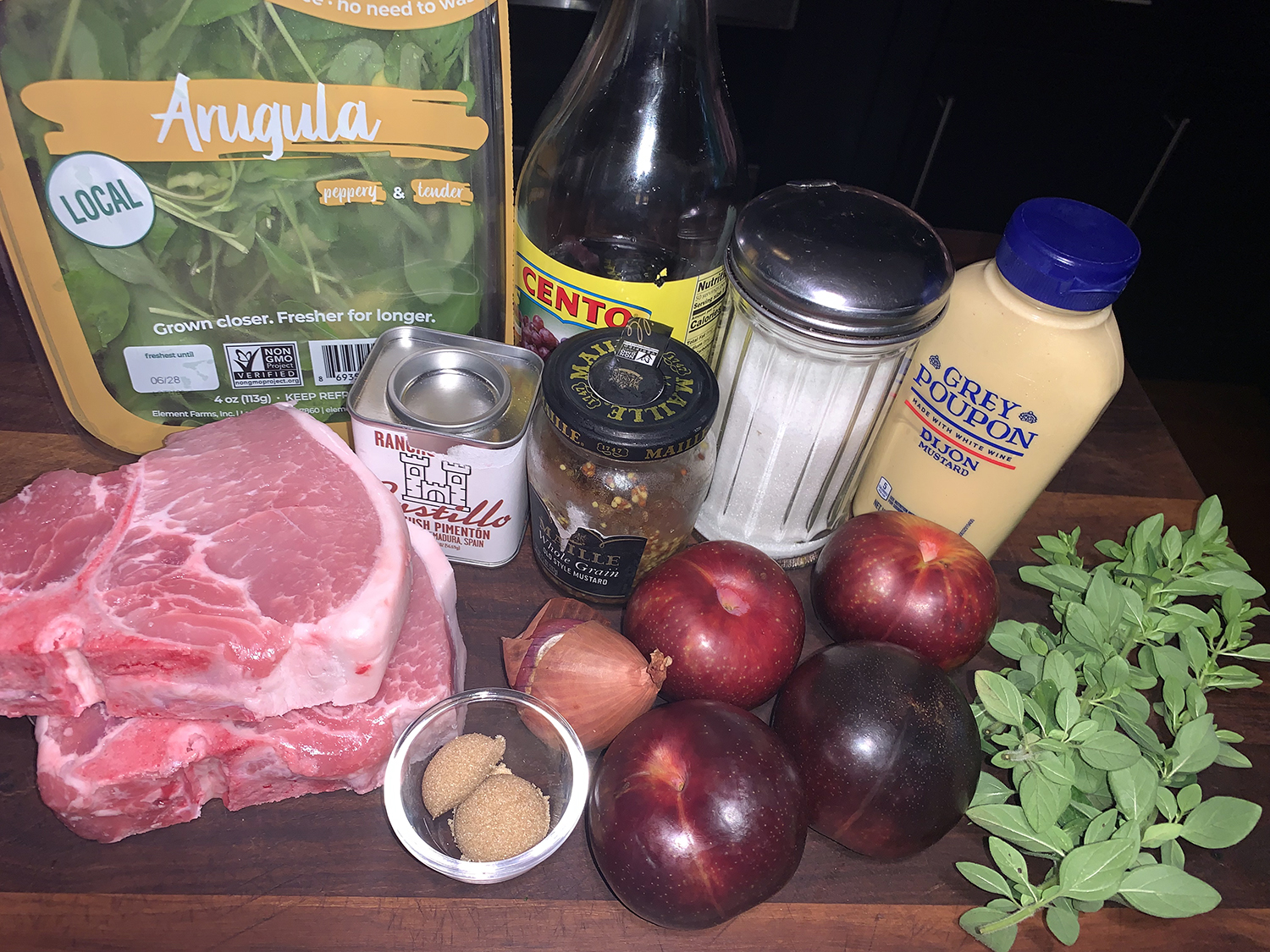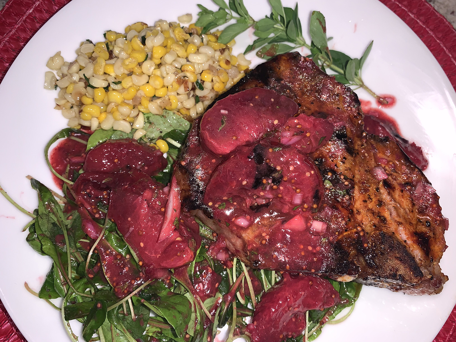 No doubt this will get on our rotation for company in the near future. The plum mostarda can easily be made ahead and rewarmed the evening of the party. All the host would have to do is season and grill the chops. The arugula gets mixed with a little of the sauce, and a simple side dish, such as a corn sauté completes the meal.