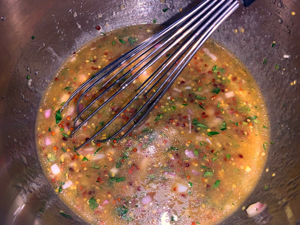 Meanwhile in the reserved bowl, whisk together the citrus juice, mustard, honey, 1/2 teaspoon salt and 1/4 teaspoon pepper. Set aside.