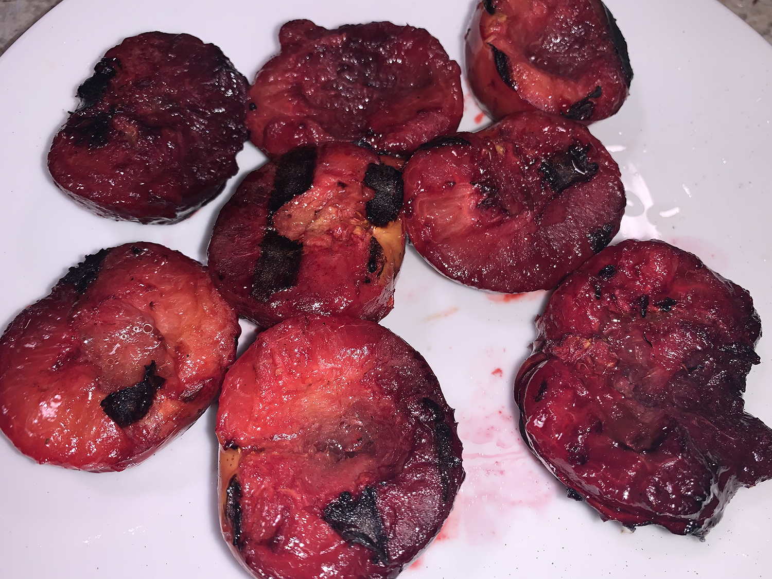 Prepare a grill for medium-high heat; oil grate. Grill plums, cut side down, until charred and fruit releases easily from grill, about 2 minutes. Transfer to a cutting board and let cool.