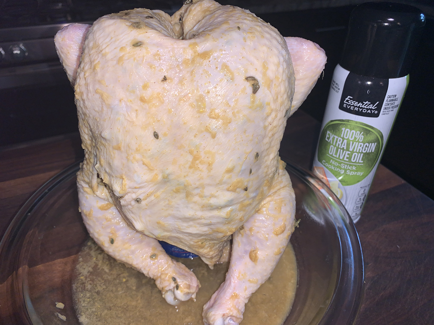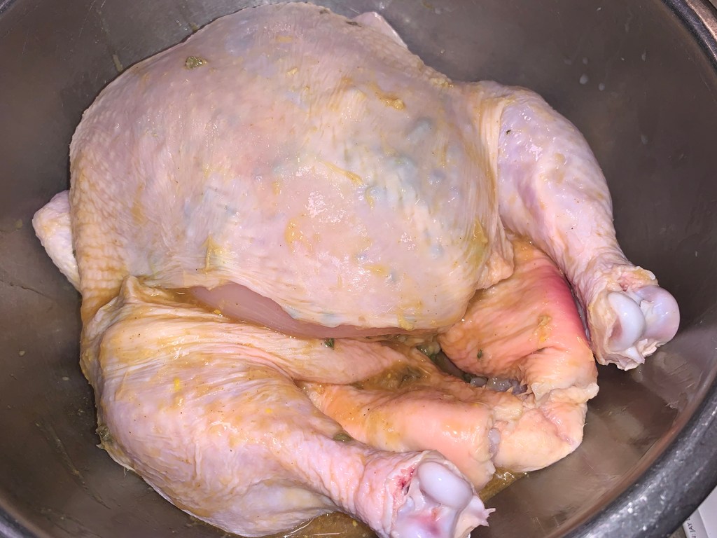 Place chicken in bowl with cavity end facing up. Slowly pour marinade between skin and meat and rub marinade inside cavity, outside skin, and under skin to distribute. Cover and refrigerate for 24 hours, turning chicken halfway through marinating.