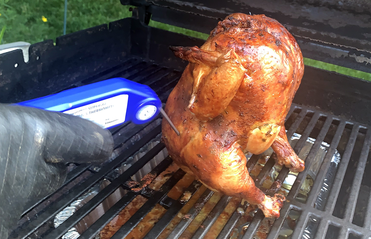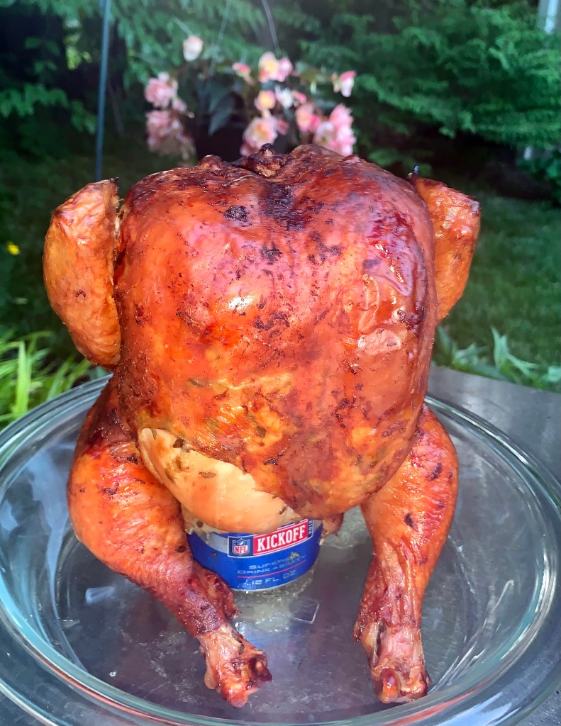 Scrape cooking grate clean with grill brush. Transfer chicken with can to center of cooking grate with wings facing piles of coals (or outer burners on gas grill) at 3 and 9 o’clock (ends of drumsticks should rest on grate to help steady bird). Cover grill and cook for 15 minutes.