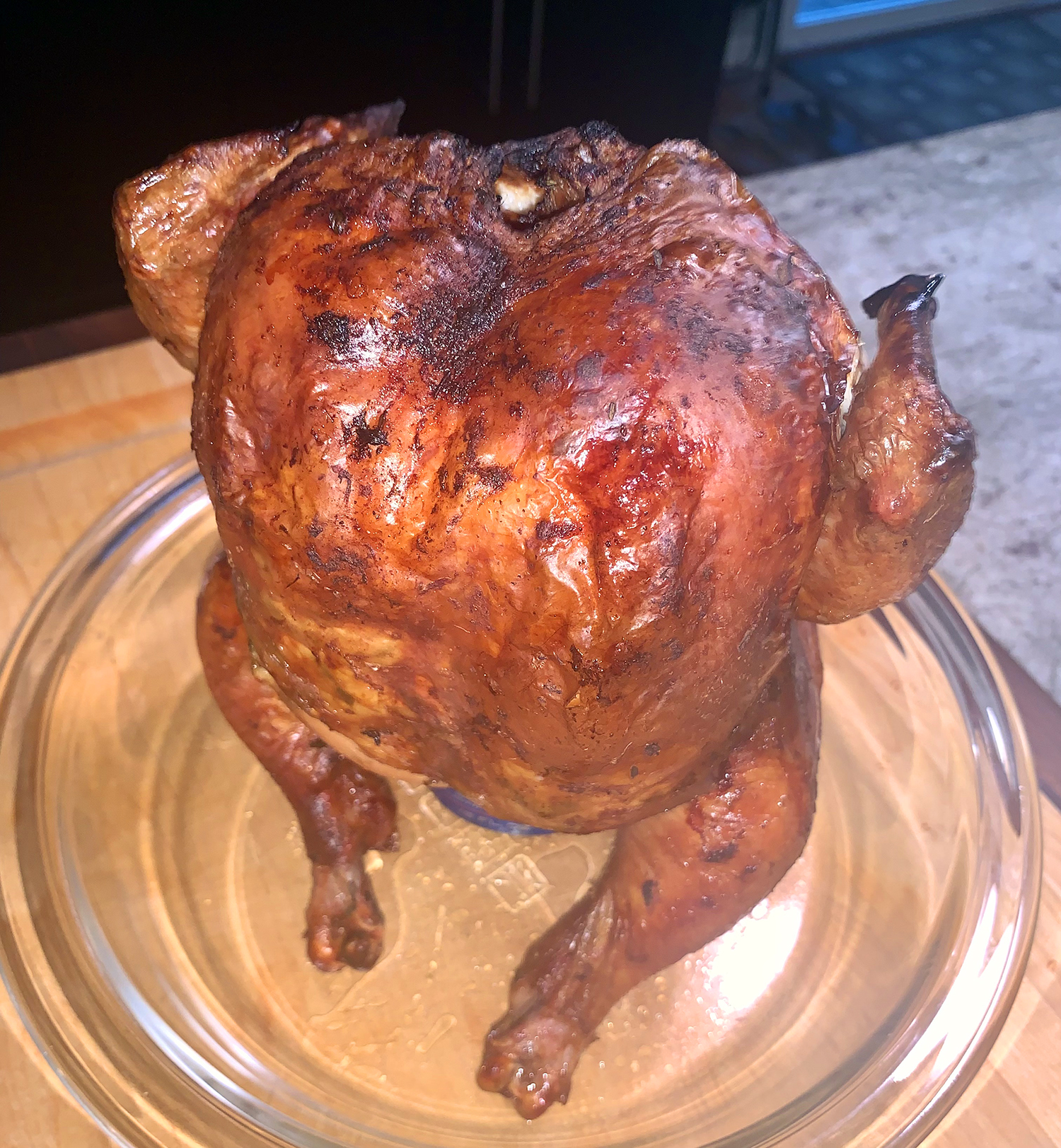 Using tongs and wad of paper towels, rotate chicken 90 degrees so wings are at 6 and 12 o’clock. Continue cooking and turning chicken at 15-minute intervals until thickest part of thigh registers 170 to 175 degrees, 1 hour to 1¼ hours longer.