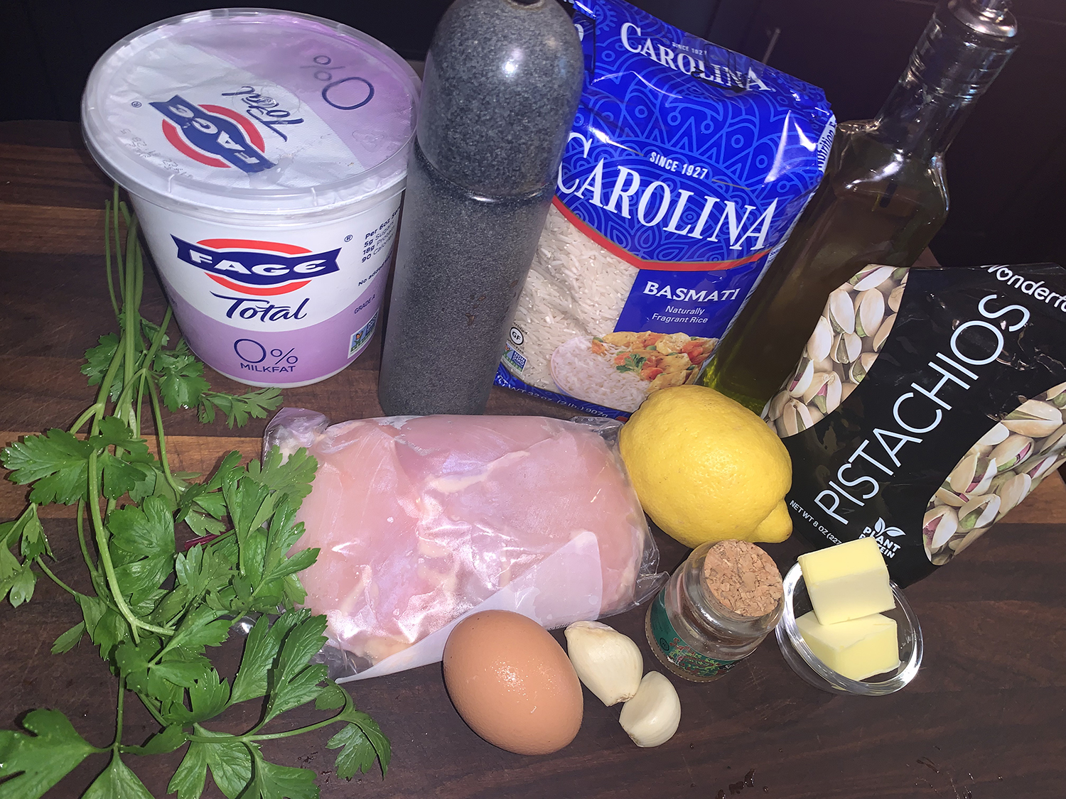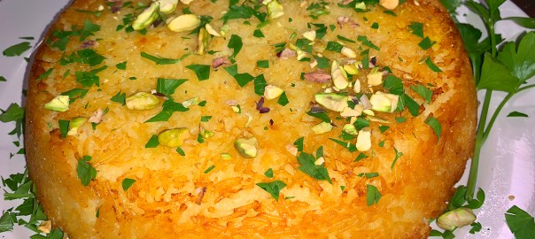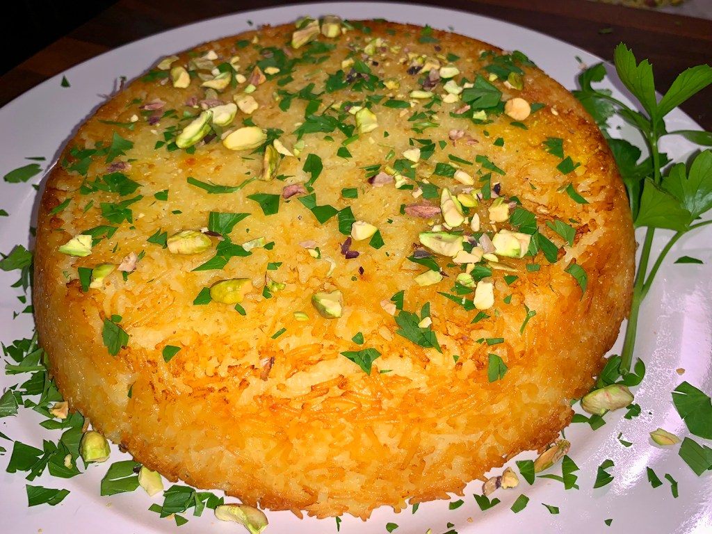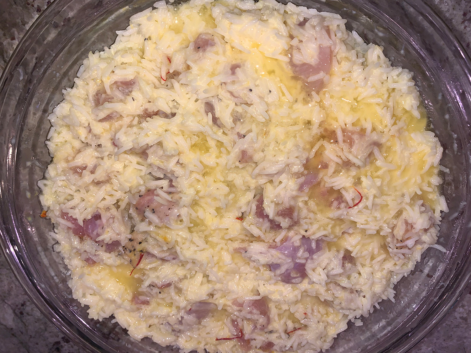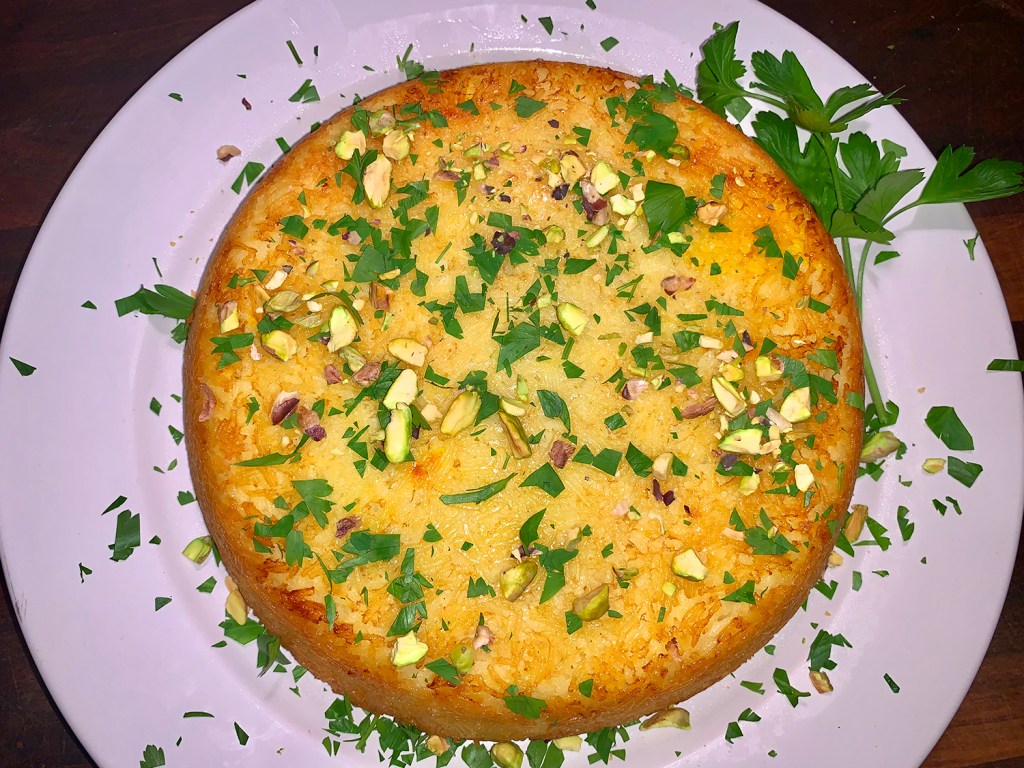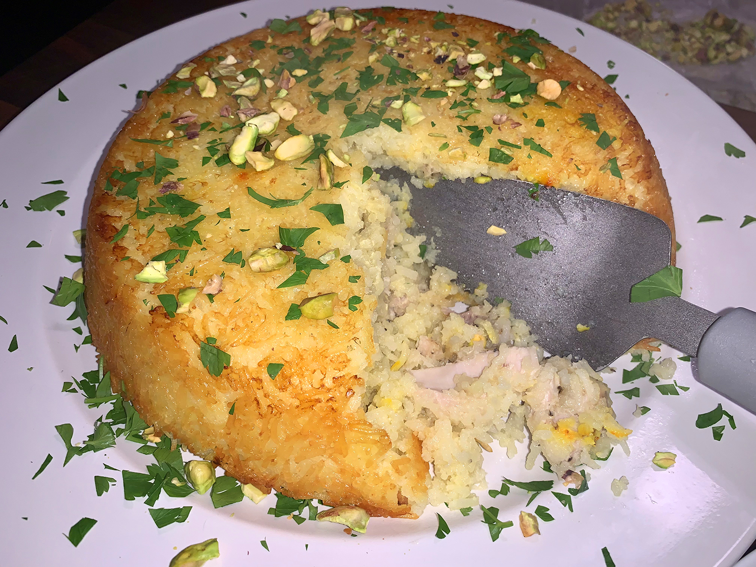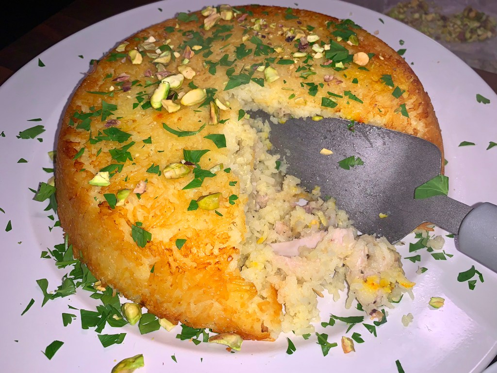 Tahchin is a traditional Persian dish of basmati rice mixed with saffron, yogurt and egg yolks, then baked into a cake. Here however, a tahchin morgh, or tahchin with chicken is made with a shortcut by simply layering uncooked pieces of seasoned chicken thighs into the rice so they bake right into the grains.