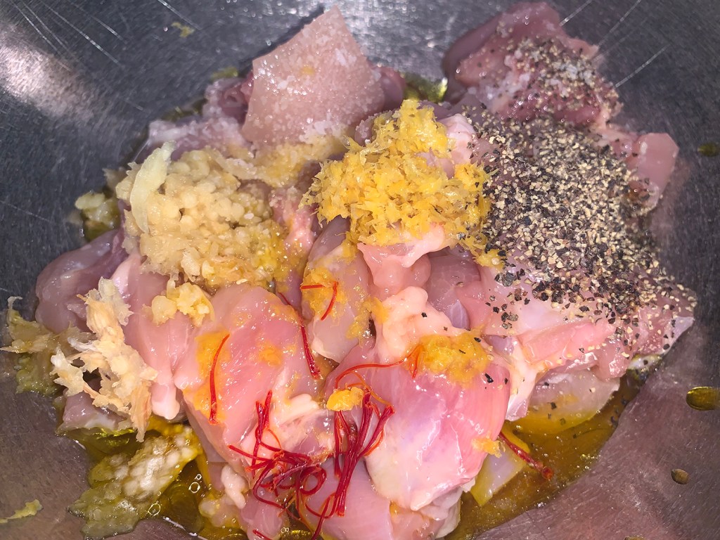 In a medium bowl, combine the chicken, remaining 1 tablespoon oil, 1 teaspoon of the lemon zest, the garlic, ½ teaspoon each salt and pepper and 1 tablespoon of the saffron water. Stir until the chicken is evenly coated; set aside at room temperature.