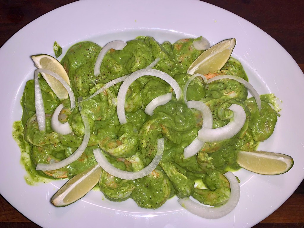Based on a classic Mexican fish dish pescado en salsa poblano, or fish in poblano sauce, this recipe is a shrimp version. To make the creamy, vibrantly hued sauce that cloaks plump, gently cooked shrimp, poblano chilies, with their earthy flavor and moderate heat, are puréed with cilantro, alliums and Mexican crema, a rich cultured cream similar to, but milder than sour cream.