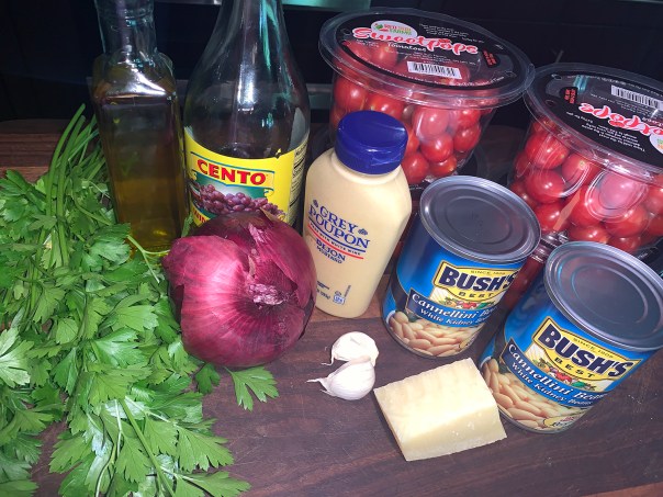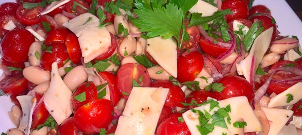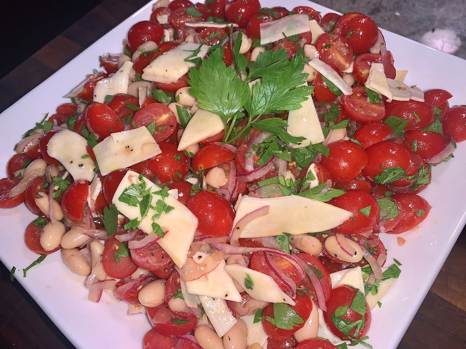 Place the tomatoes, white beans and parsley in a large bowl. Pour the dressing over the salad, toss well, then gently fold in the Parmesan.