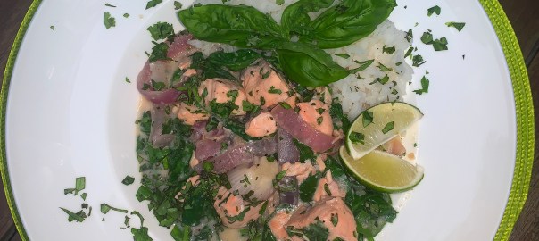 Divide rice among bowls. Top with salmon curry, basil and cilantro. Serve with lime wedges for squeezing on top.