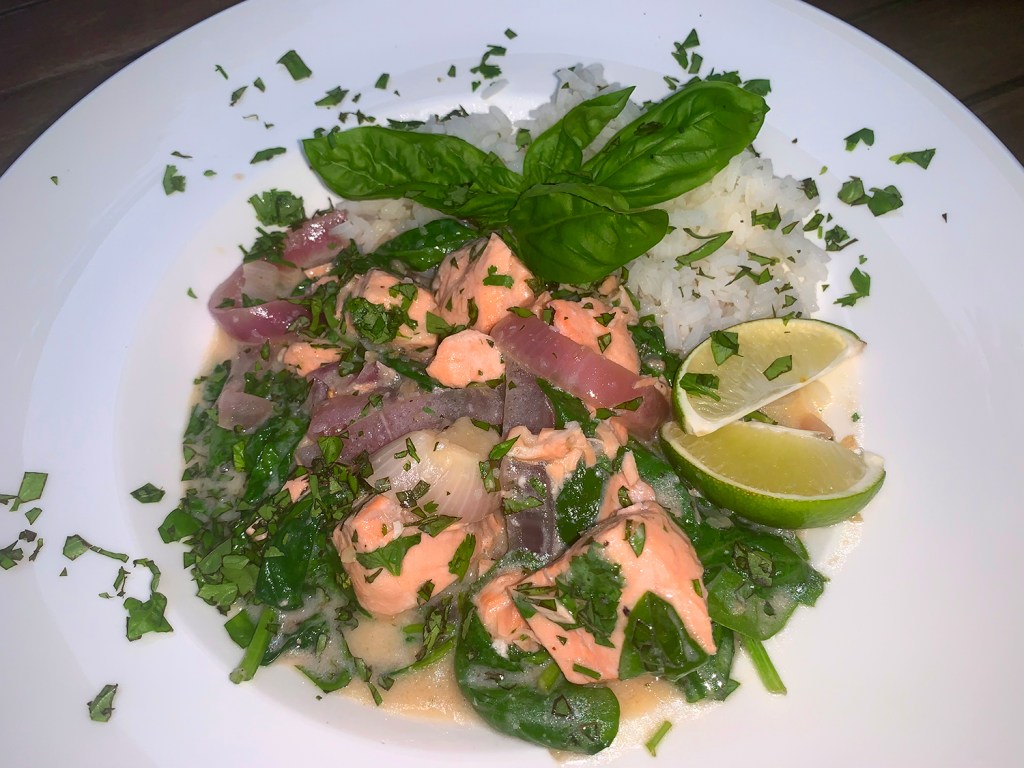 Adding coconut milk creates a rich broth that works with a wide range of seafood. Salmon is used here, but flaky white fish, shrimp or scallops would all benefit from this quick poaching method. A squeeze of lime and a flurry of fresh herbs keep this curry bright and citrusy. For a hit of heat, garnish with sliced fresh jalapeño or serrano chile peppers.