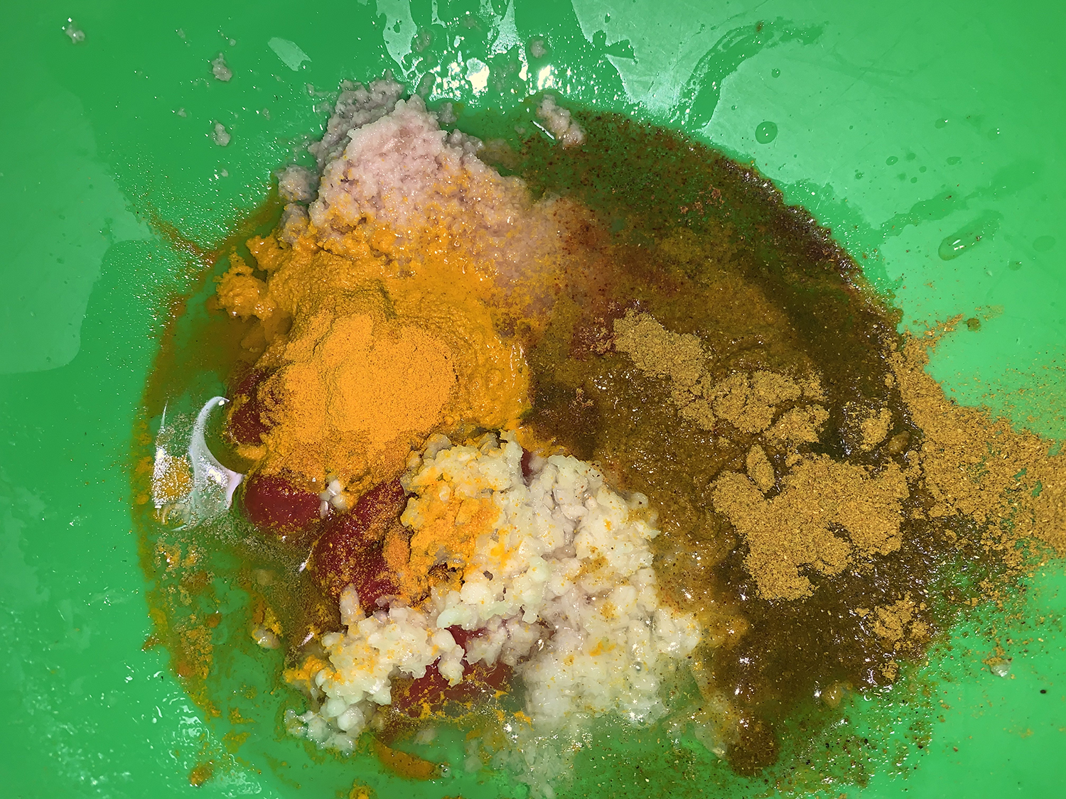 In a large bowl, stir together the oil, tomato paste, lemon juice, ginger, garlic, curry powder, turmeric, cayenne, 1¼ teaspoons salt and ½ teaspoon black pepper.