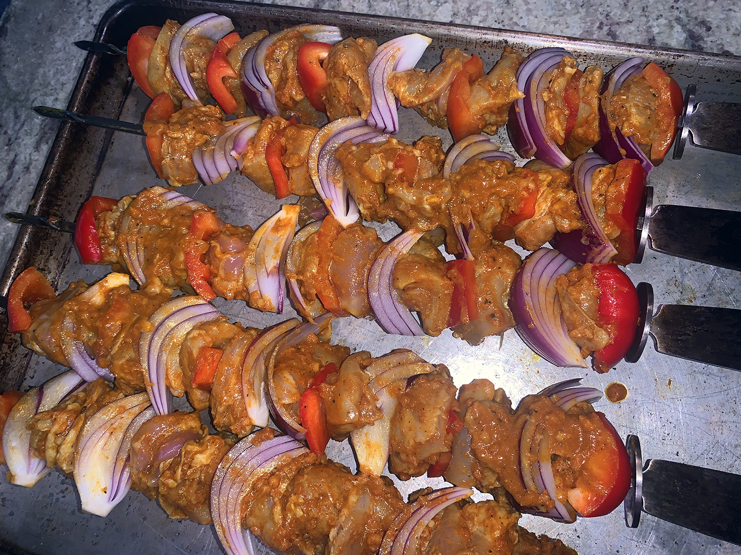 Don’t worry if the cut pieces of chicken are irregularly shaped. As long as they’re similarly sized, shape isn’t important. Don’t crowd the skewers on the grill grate. Allow some space between them so heat circulates and the chicken cooks quickly and without steaming.