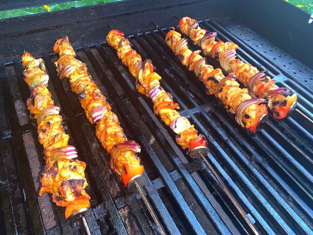 Flip the skewers and cook, turning every few minutes, until charred all over and the chicken is no longer pink when cut into, another 8 to 9 minutes.