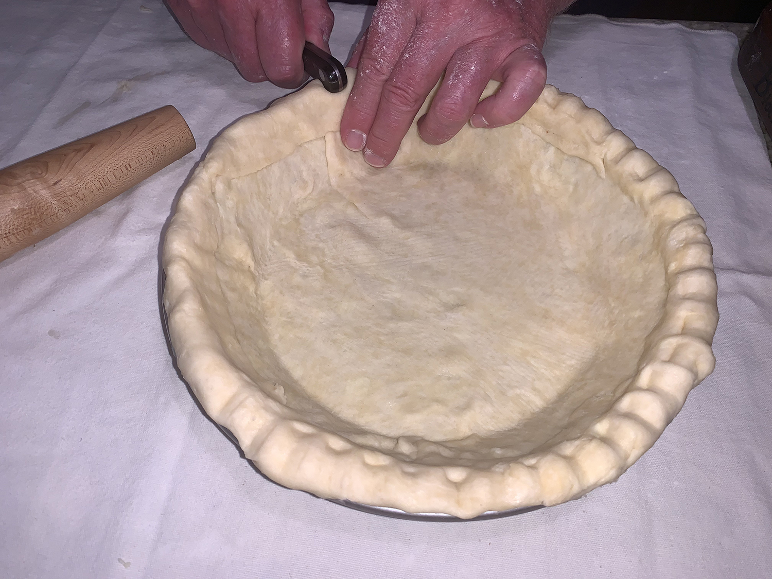 After you’ve made sure the dough fits the pan well, trim the dough that’s hanging over with a sharp knife and chill for another 20 minutes. The Hubs used the extra dough and added it around the perimeter and notched it with the end of a knife to crimp the edges. This helps the crust from shrinking.