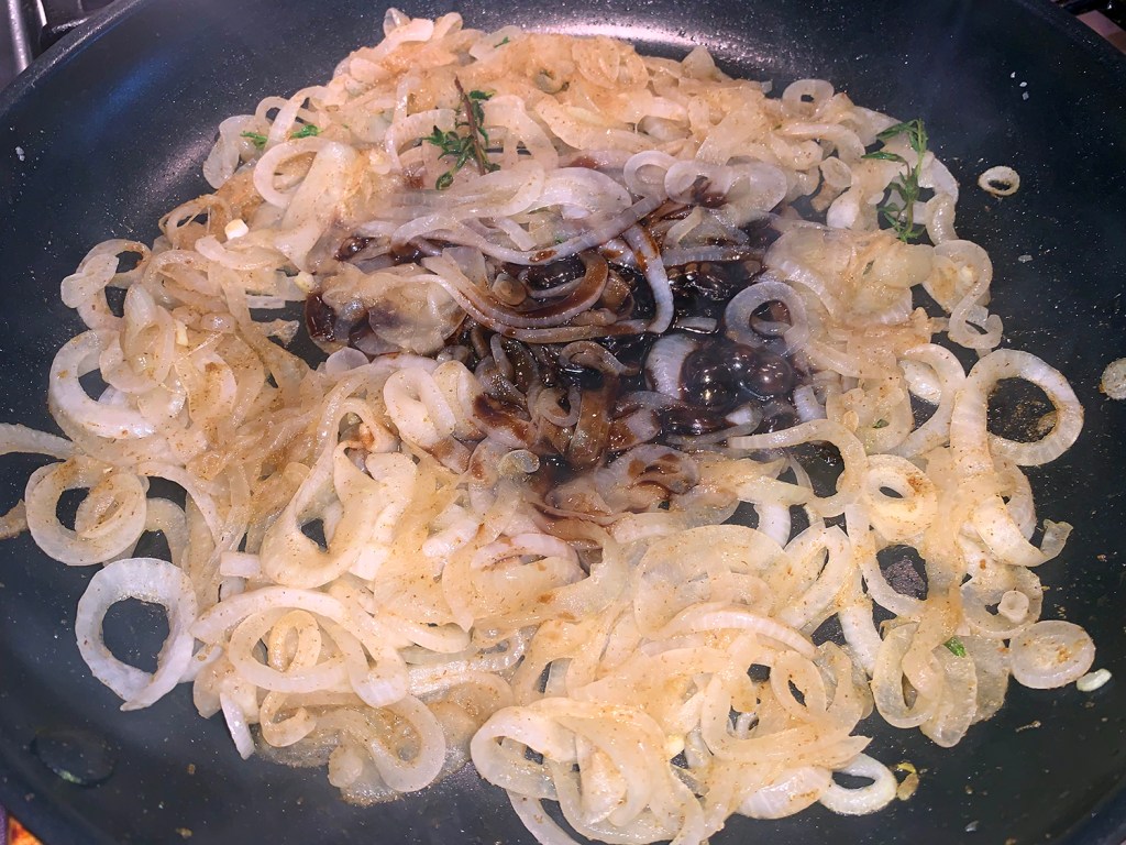 As the onions are softening, after 5 minutes, add the balsamic vinegar.