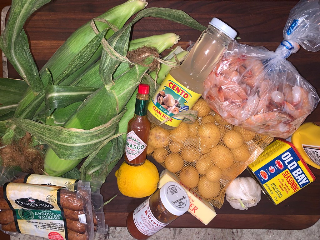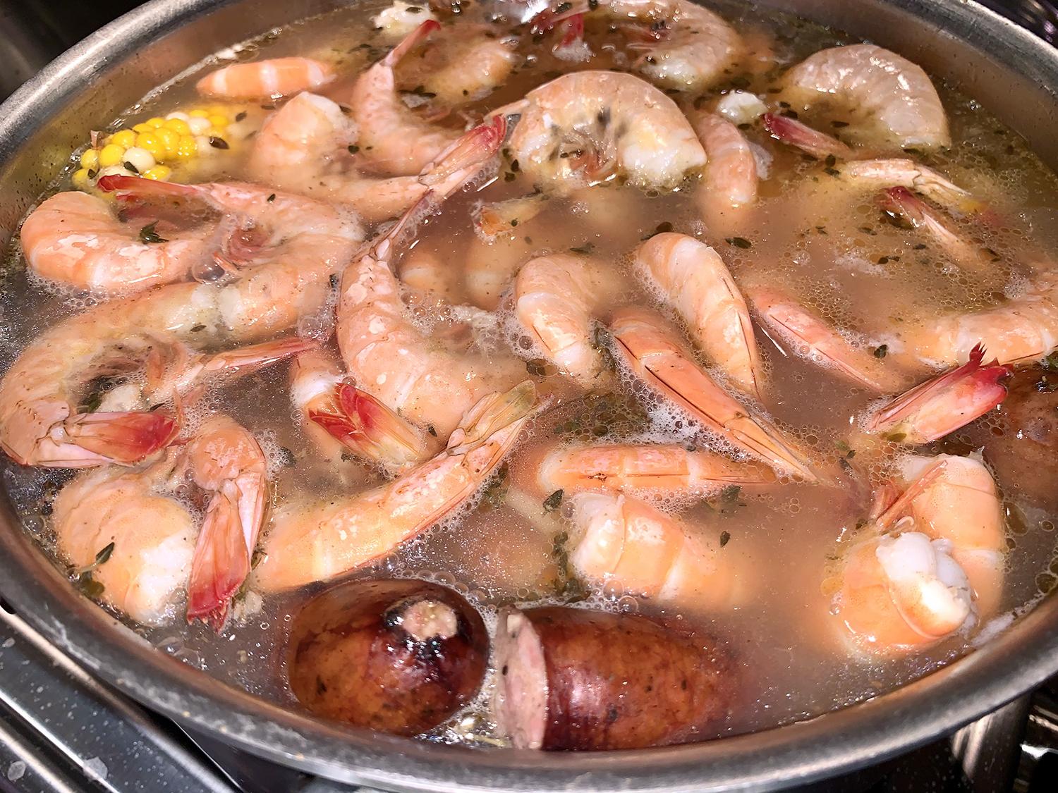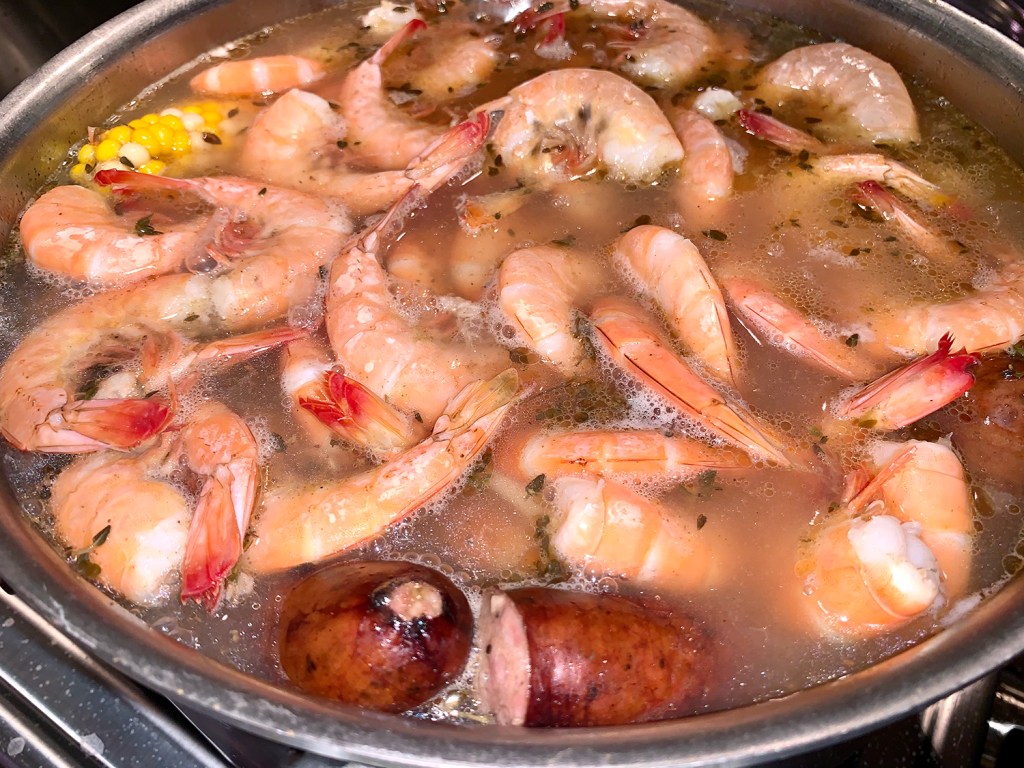 In it, sweet, plump Gulf shrimp, corn, potatoes, and andouille sausage, come together in a flavorful cooking liquor. It is recommended to use large shrimp in the shell, which helps prevent overcooking and imparts its own flavor to both the shrimp and broth. Add dense ingredients like potatoes and corn first, then sausage, then shrimp. Just before serving, the boil is finished in a garlic spice butter. Yummy!