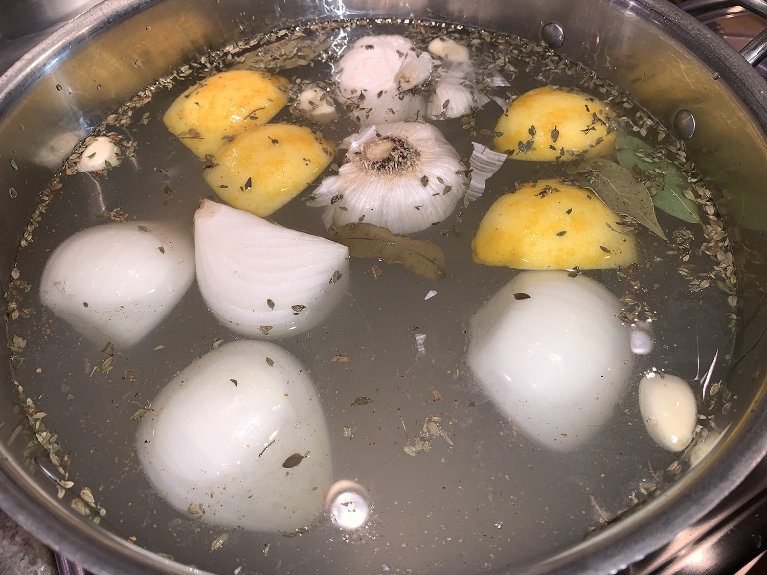 Like “Barbecue,” “Shrimp Boil” is both a noun and a verb. While all of the flavors are important, the real flavor from a boil comes from a potent cooking liquor. This broth takes it aromatic flavors from alliums, lemon and spices; while a bottle each of white wine and clam juice add heft.