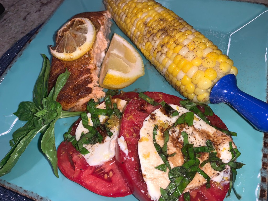 To complete the meal, we boiled fresh ears of corn, and grilled a cedar-planked salmon with a North African spice rub—both of which took about the same amount of time to cook. Deliscioso!
