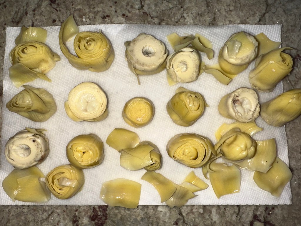 - Cut leaves from artichoke hearts. Cut hearts in half and dry with paper towels. Place leaves in bowl and cover with water. Let leaves stand for 15 minutes. Drain well.