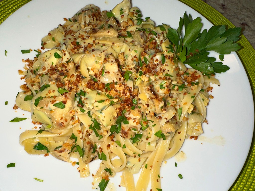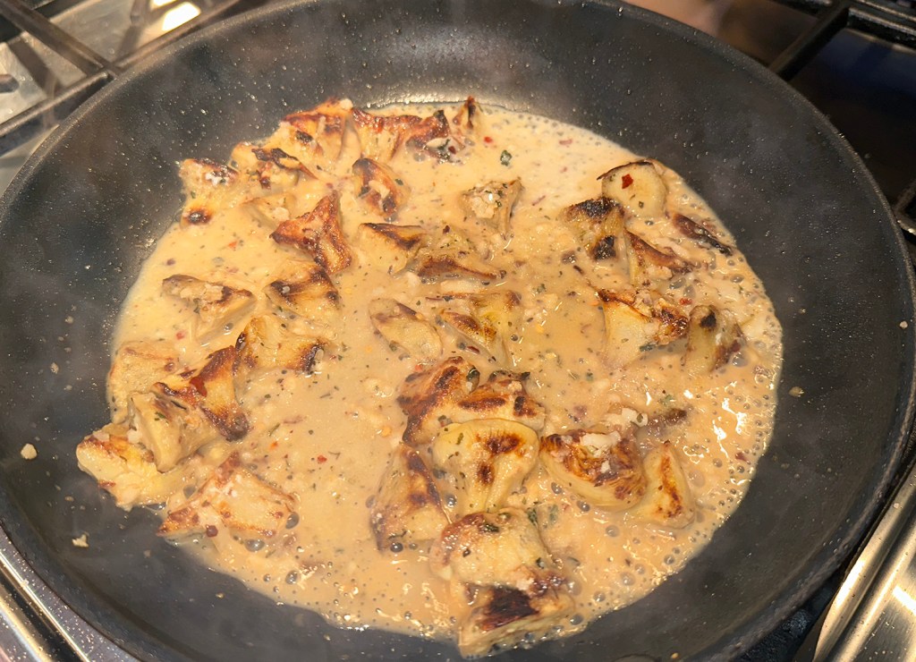 Anchovy gives the sauce savory depth without imparting a fishy taste—don’t omit it; and cream ties together the aromatics, wine, and artichoke flavor. A simple Parmesan bread-crumb topping gives the dish some savory crunch. Even though it adds more carbs, the crumb topping adds another dimension and necessary texture.