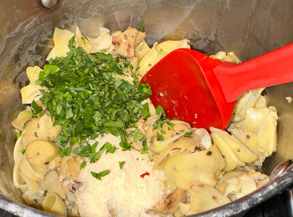 - Stir in wine and cream and bring to simmer. Remove skillet from heat and stir in artichoke leaves. Set aside.