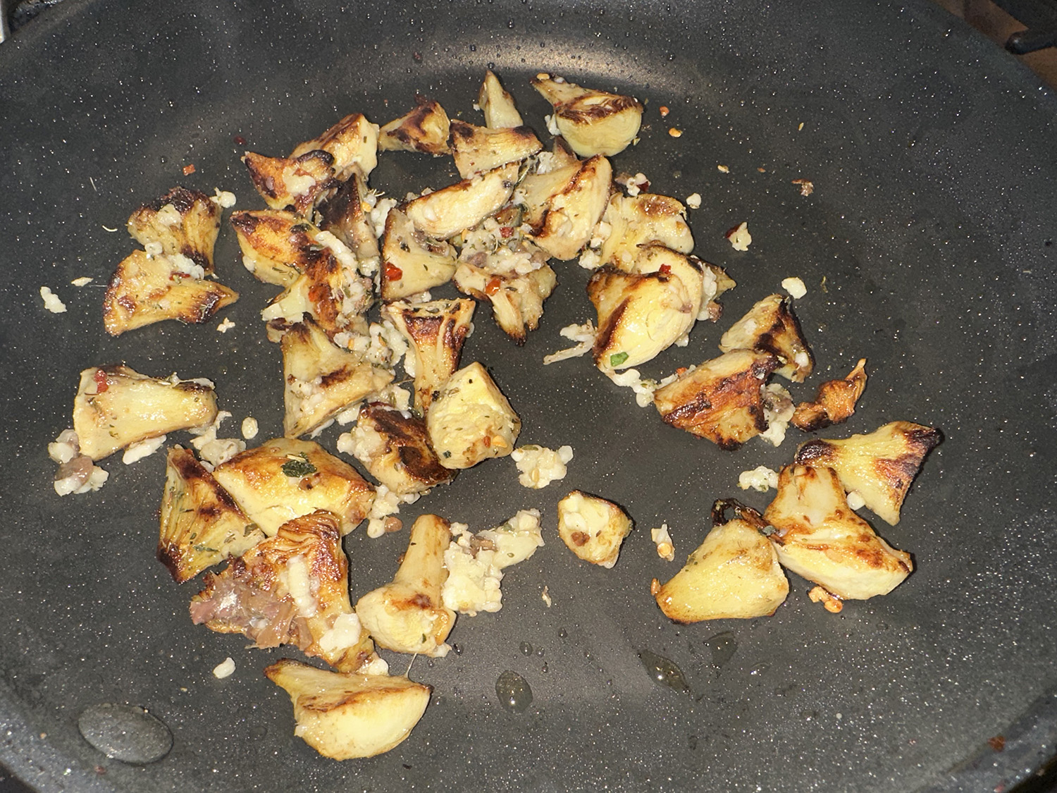 - Heat 1/2 tablespoon oil in now-empty skillet over medium-high heat until shimmering. Add artichoke hearts and pinch salt; cook, stirring frequently, until hearts are spotty brown, 5 to 7 minutes.