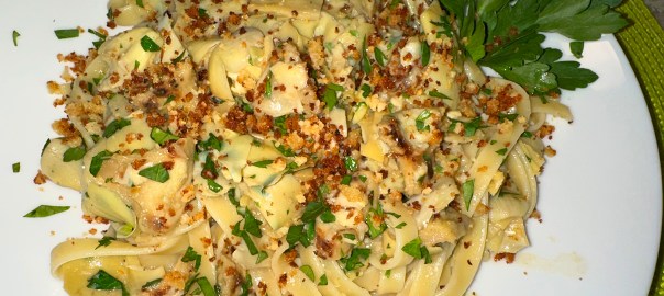 This recipe can easily be doubled to feed 4 or 5 guests. Unable to source tagliatelle (who knows why, it is usually a popular pasta), we substituted fettuccini, though pappardelle would also work.