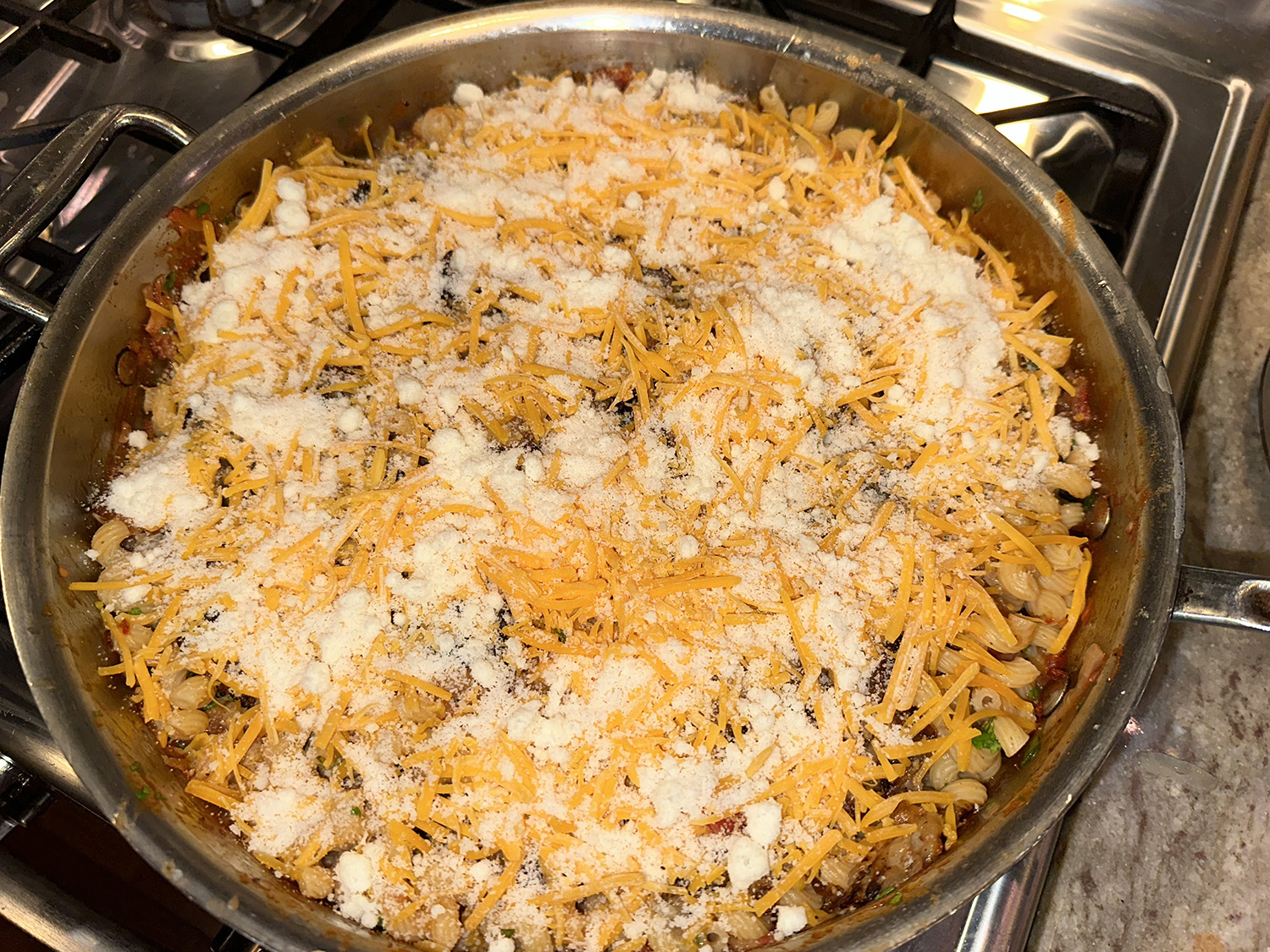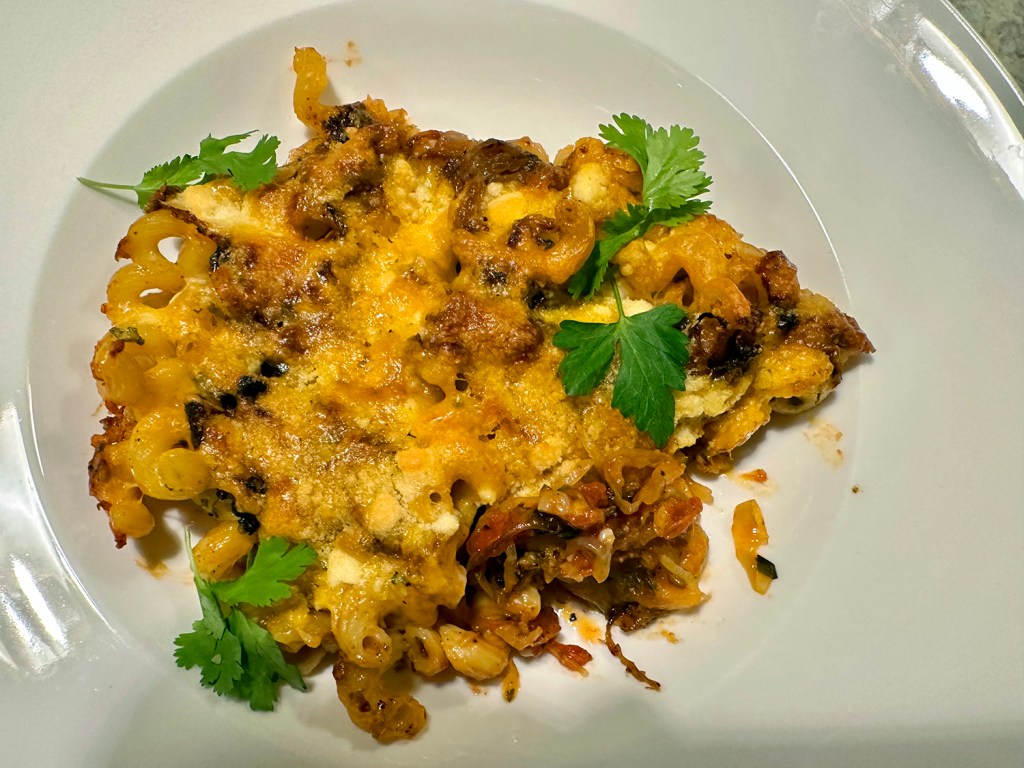 On addition to sliced scallions and chopped cilantro, we topped the chili with grated Cotija cheese. It is a Mexican, dry grated cheese, made from cow’s milk and can be compared to the taste of feta and parmesan. BTW, queso fresco means “fresh cheese” in Spanish, the best substitute for cotija if you can find it in stores or happen to have some on hand. It is very close in flavor to cotija but is a little bit milder.