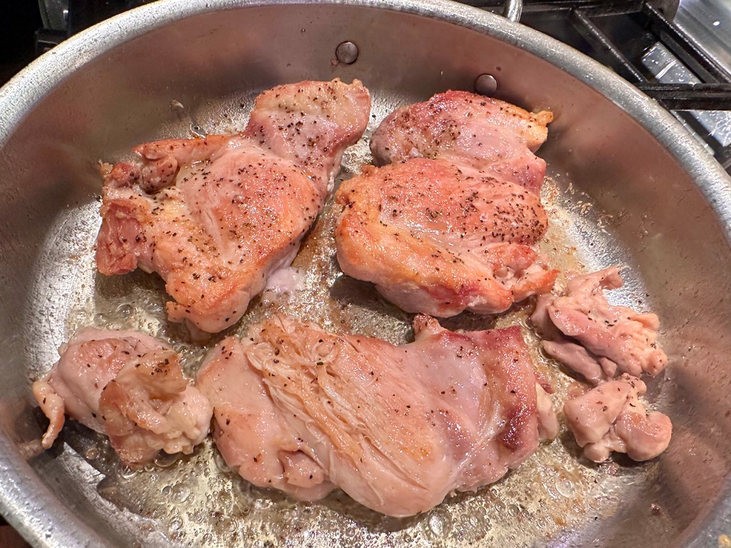 The chicken thighs are browned to develop flavor and then braised in a flavorful mix of chicken broth (preferably homemade), white wine, and red wine vinegar until it reaches 195 degrees and is meltingly tender and juicy.