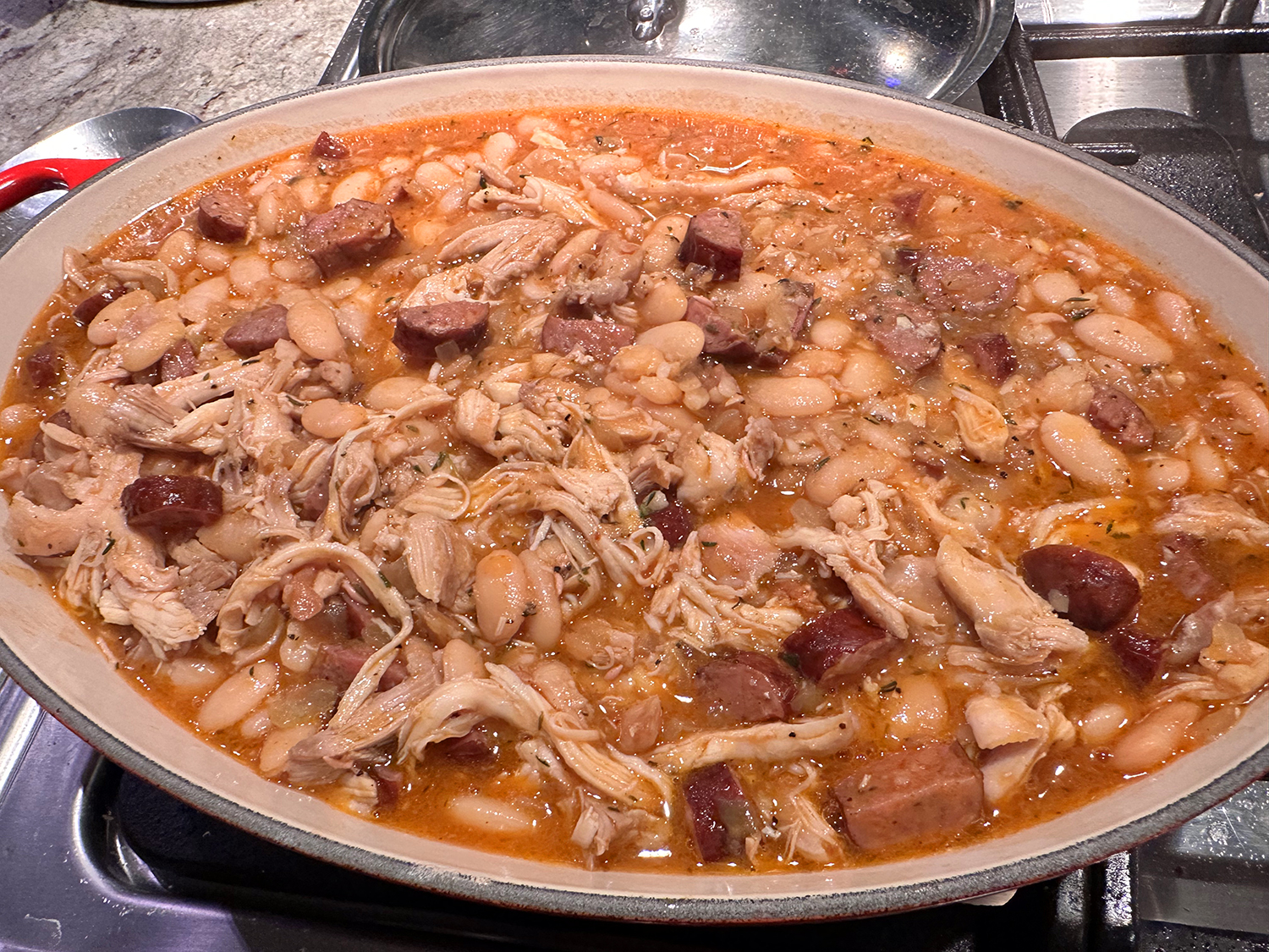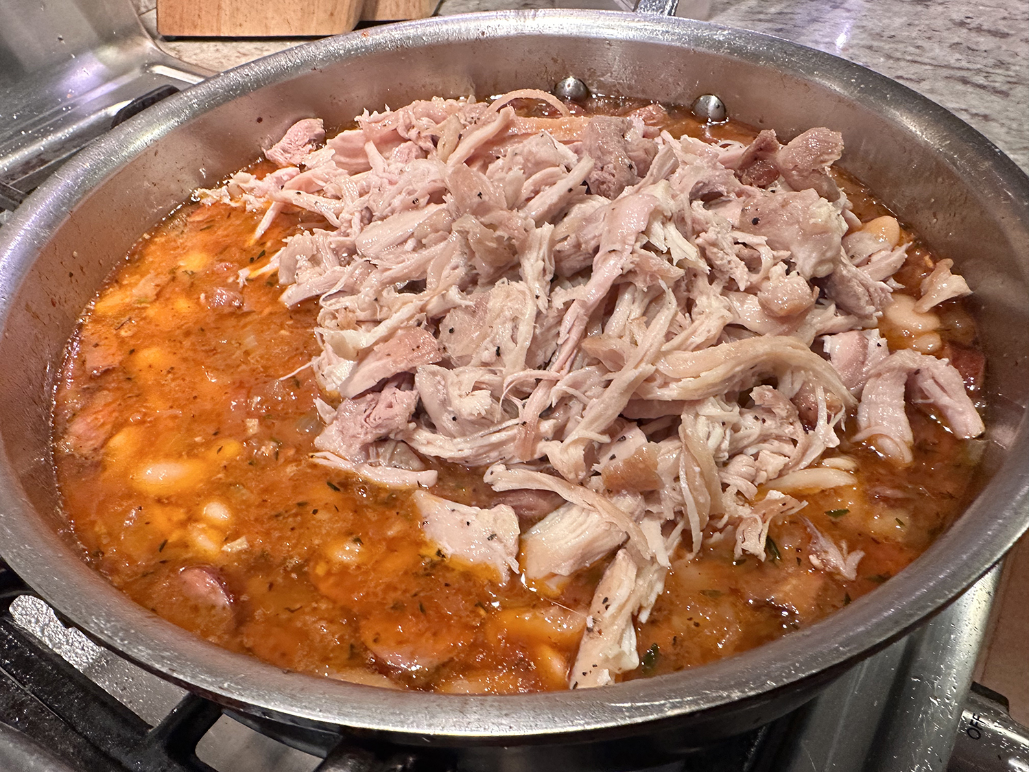 The chicken thighs are browned to develop flavor and then braised in a flavorful mix of chicken broth (preferably homemade), white wine, and red wine vinegar until it reaches 195 degrees and is meltingly tender and juicy.