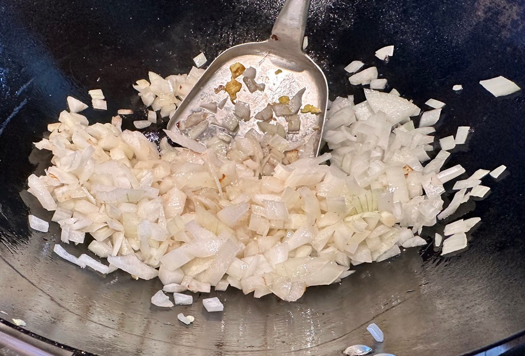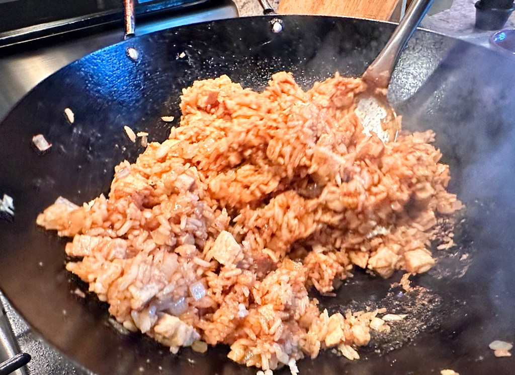- With the wok over medium heat, add a tablespoon of oil and sauté the onions until translucent and then stir in the roast pork. Add the rice and mix well. If the rice is cold from the refrigerator, continue stir-frying until the rice is warmed up, which will take about 5 minutes. If the rice was made fresh, then you just need to mix until everything is incorporated.