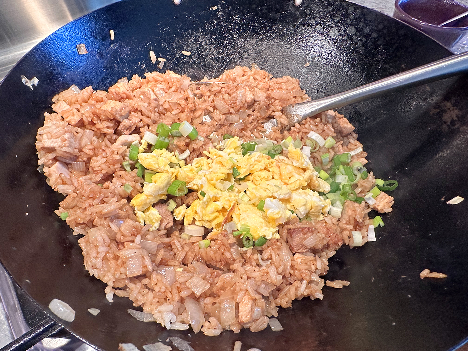- With the wok over medium heat, add a tablespoon of oil and sauté the onions until translucent and then stir in the roast pork. Add the rice and mix well. If the rice is cold from the refrigerator, continue stir-frying until the rice is warmed up, which will take about 5 minutes. If the rice was made fresh, then you just need to mix until everything is incorporated.