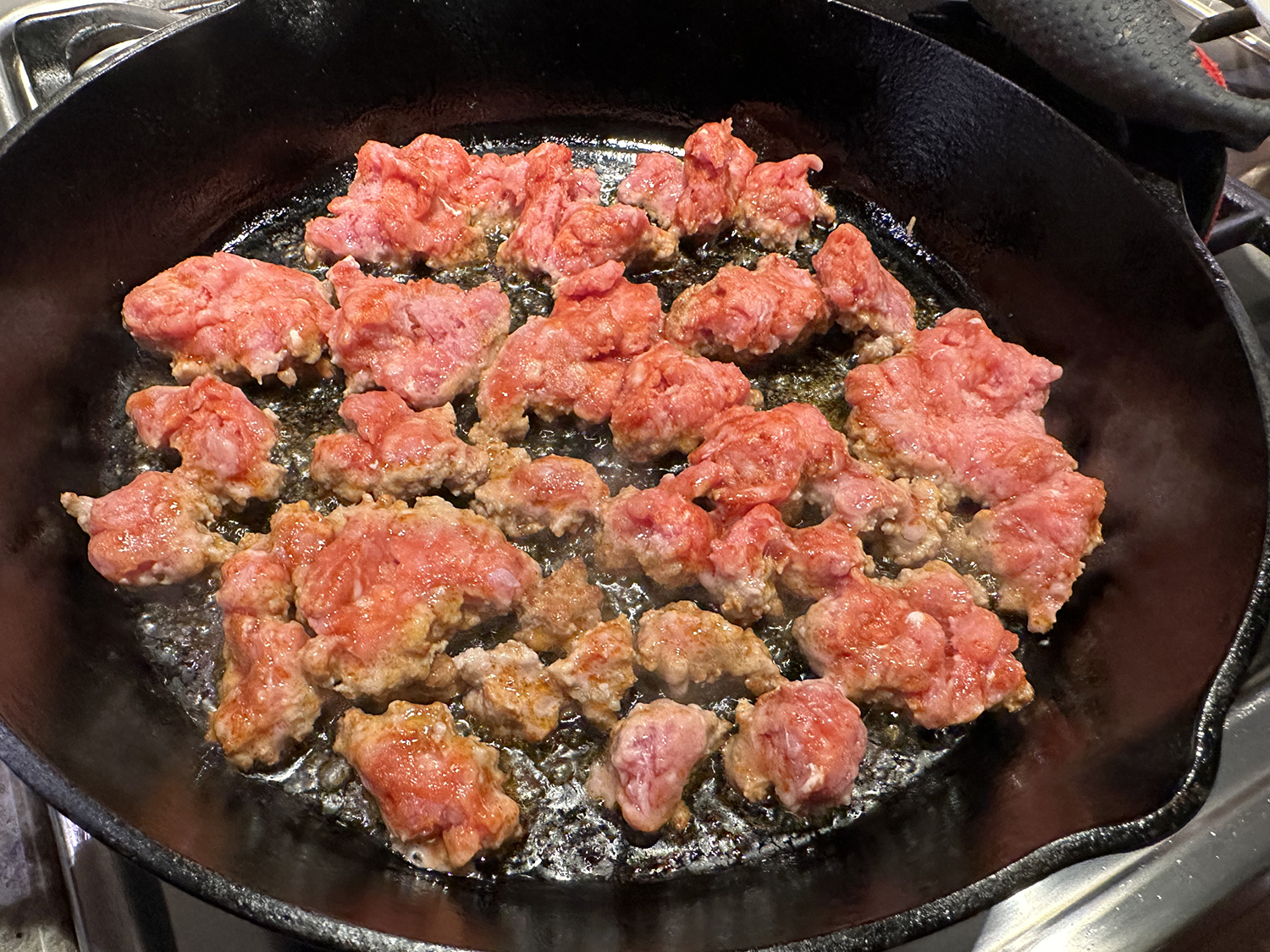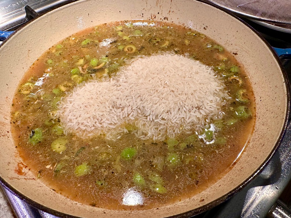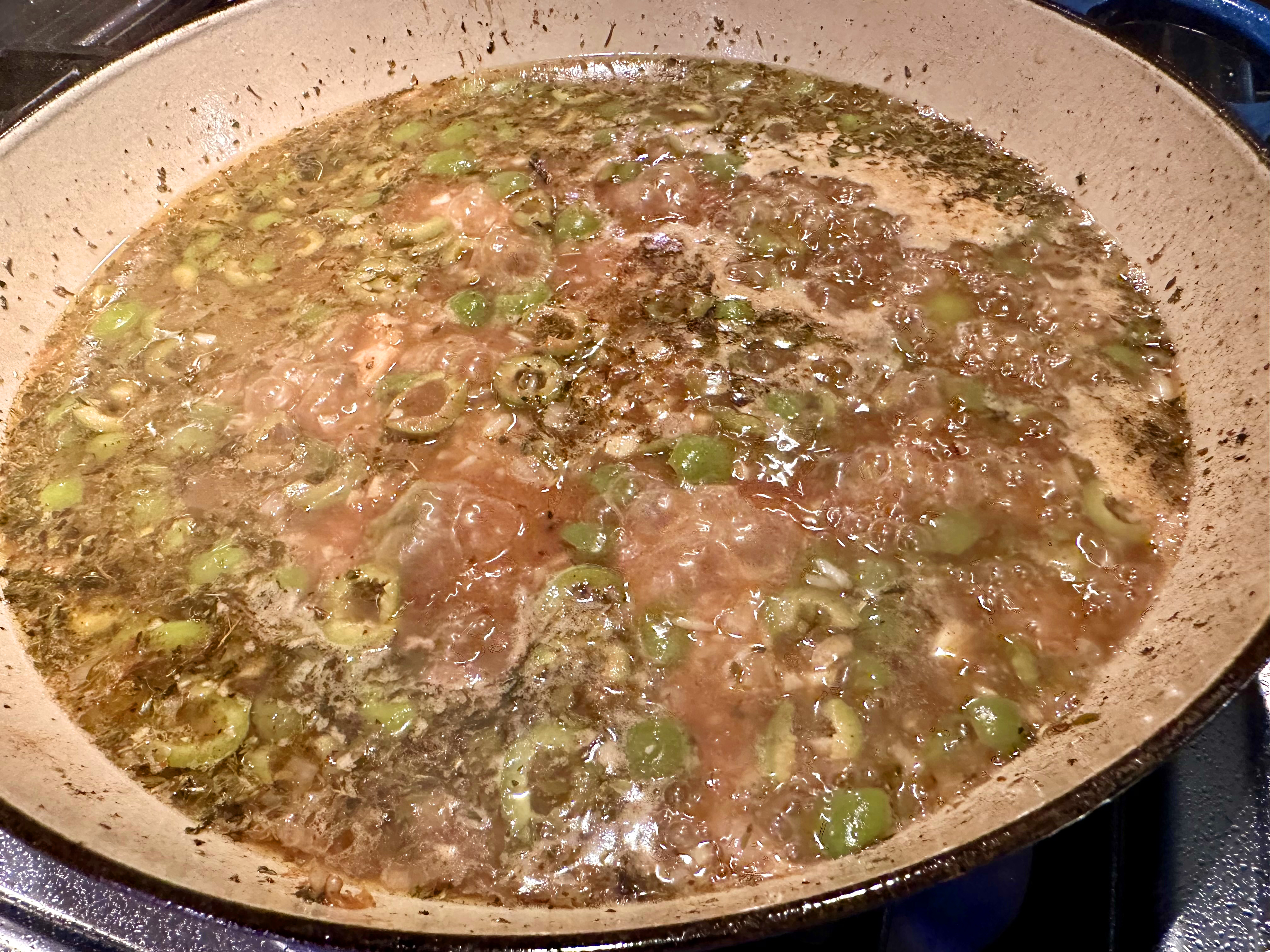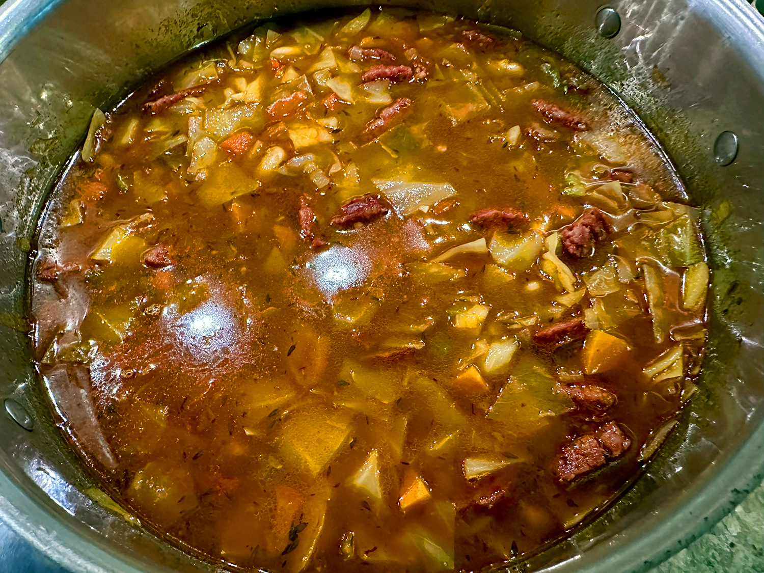 Using homemade stock always ratchets up the flavor component. Here we used a homemade ham stock, but chicken stock would work just fine. Also, our kielbasa was homemade coming from a local butchered pig, of which we bought a 1/4 share. If you prefer another type of sausage, go ahead.