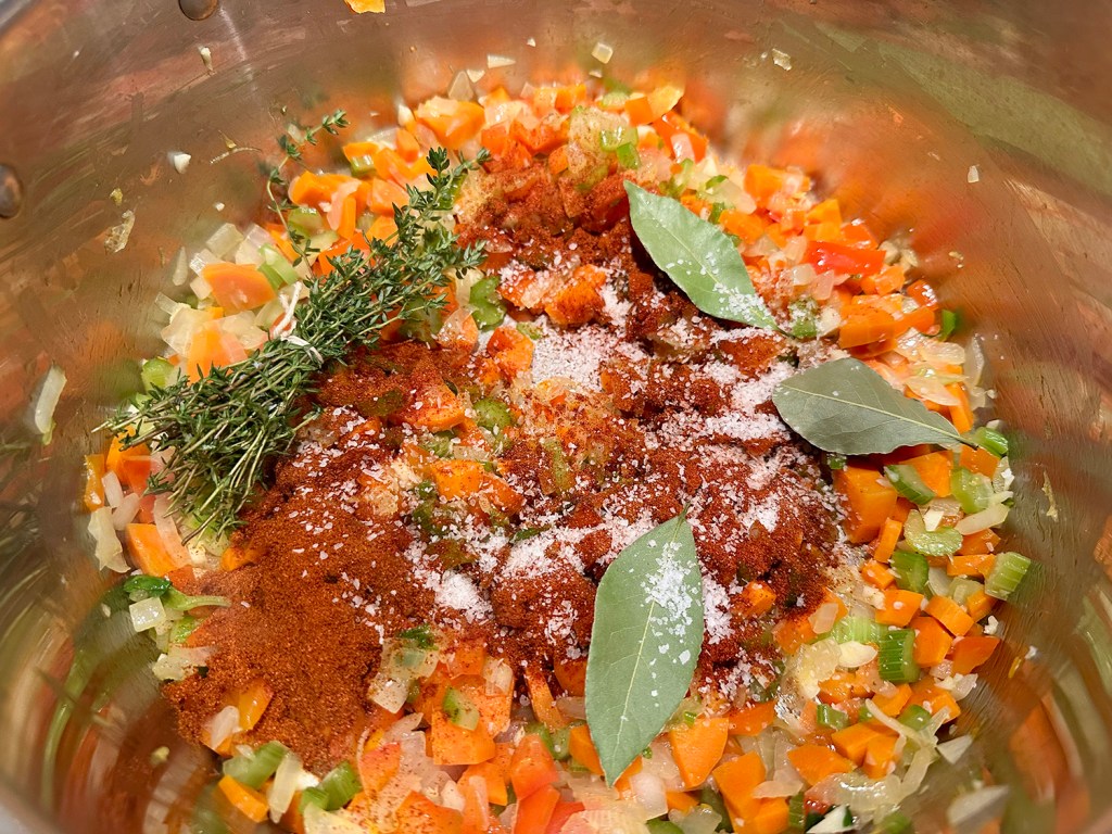 - Stir in both paprikas, salt, pepper, bay leaves and thyme