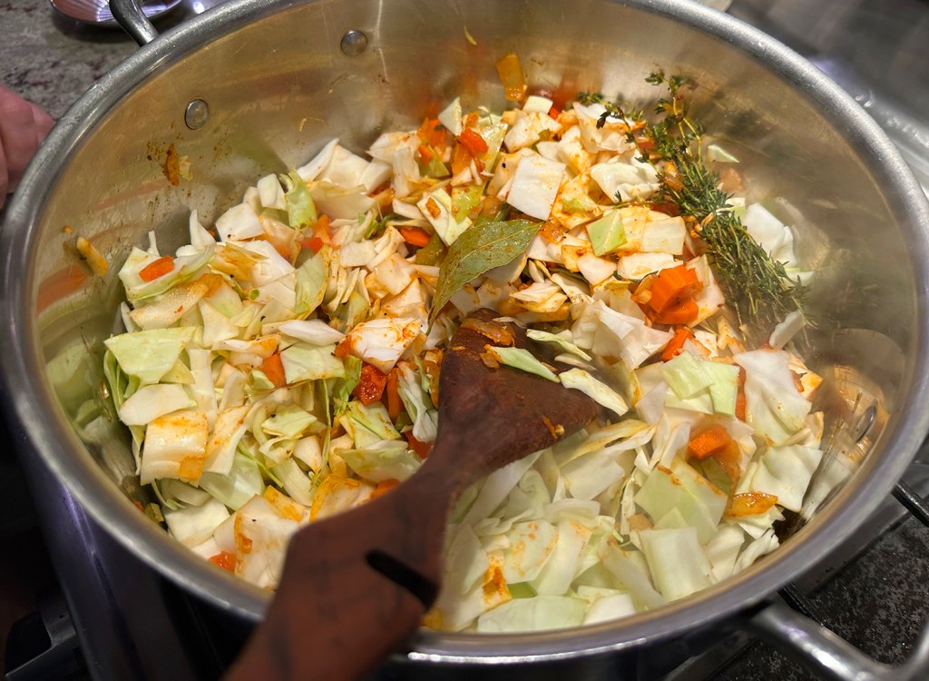 - Add cabbage, broth and 4 cups water. Bring to a boil, reduce to simmer and cover until the cabbage is tender, about 20 minutes.