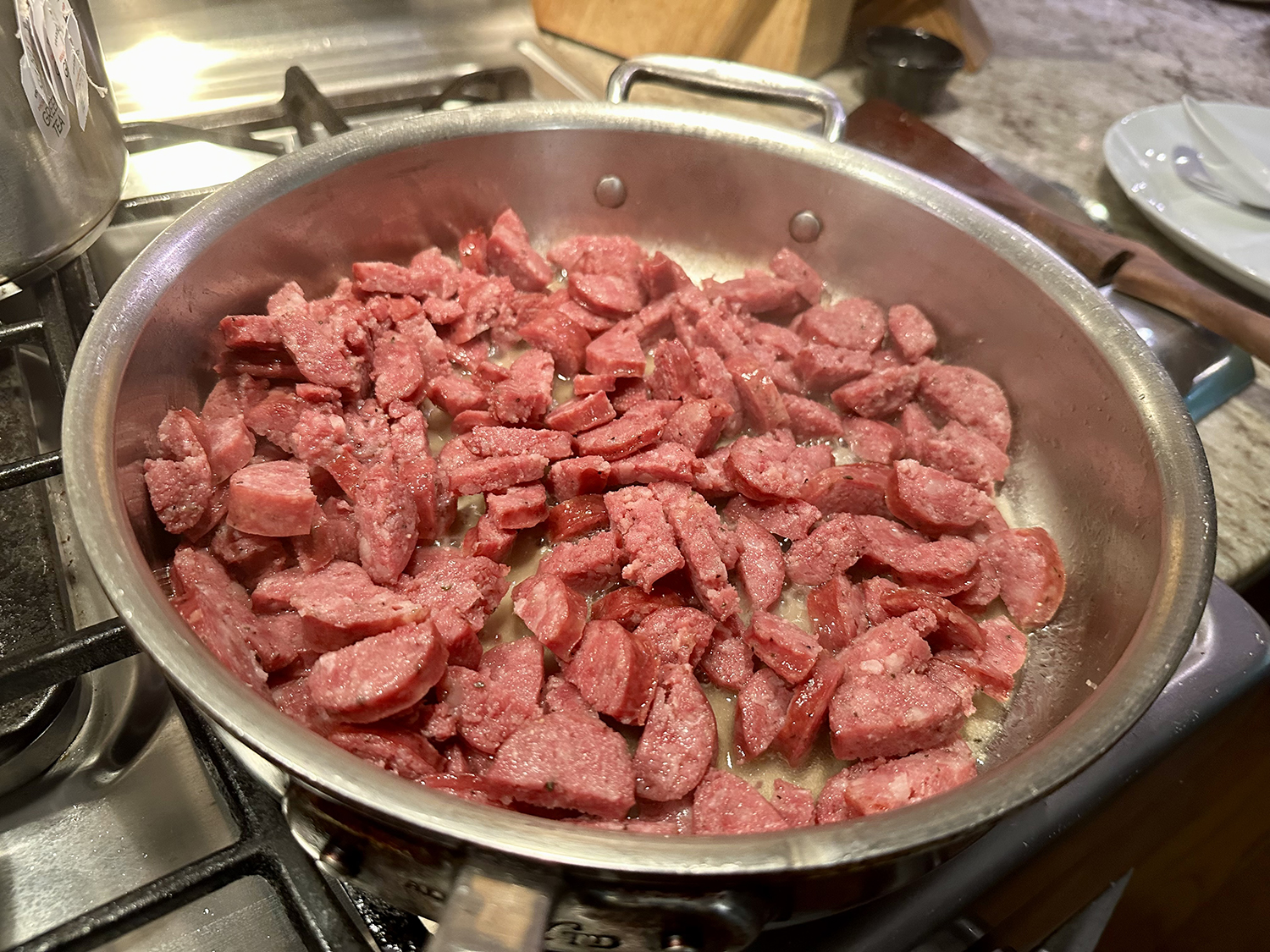 - In the meantime, heat a large pan with 1 tablespoon olive oil, add the sausage slices, and sauté for about 5 minutes stirring occasionally; remove to plate. (*This step is not necessary unless you would prefer it, OR, your sausage is not precooked.)