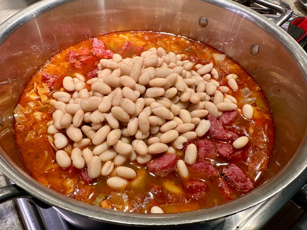 - Add beans and sausage to pot, simmer for 10 minutes. Remove from heat, taste for salt and pepper, and stir in parsley and vinegar.