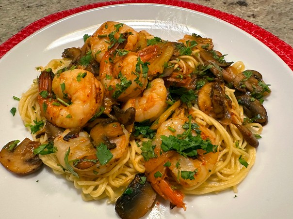 The Hubs decided to stir-fry the ginger and garlic, then instead of pushing them to the side, he removed them to a side plate so as not to burn. Next he stir-fried the chicken in two batches (remember we had more than the instructed amount), and added the ginger and garlic back to the wok with the chicken. While the recipe was very good, it just didn’t contain enough “heat” for us, so next time we’ll add some dried chili peppers to kick it up a notch.