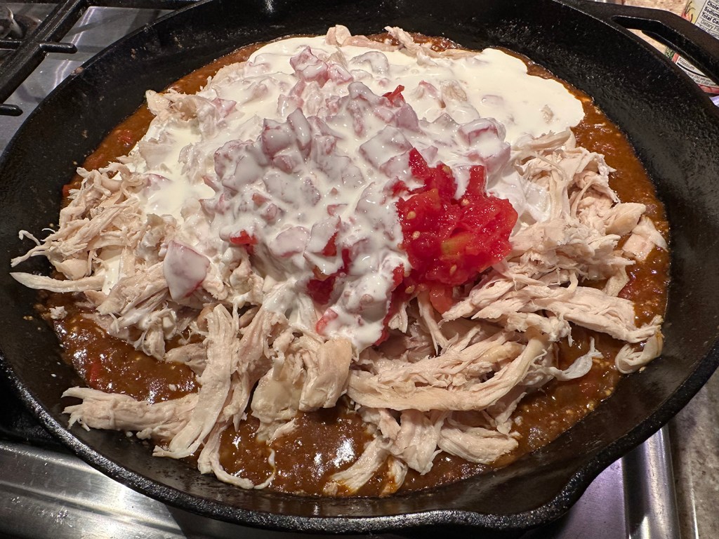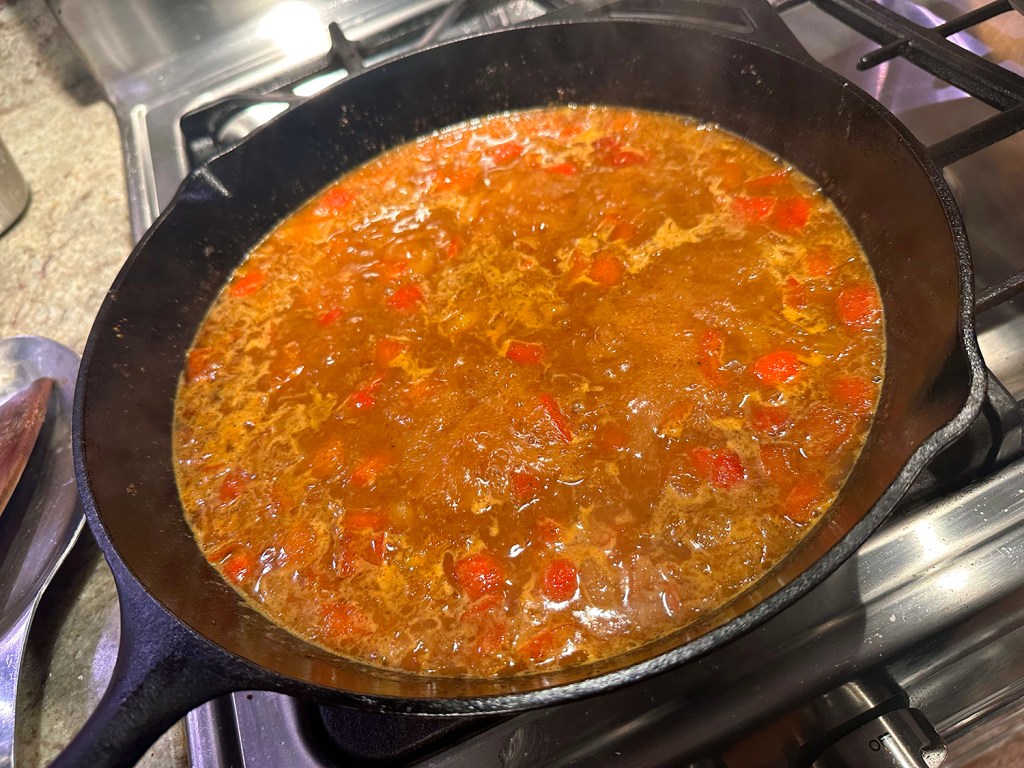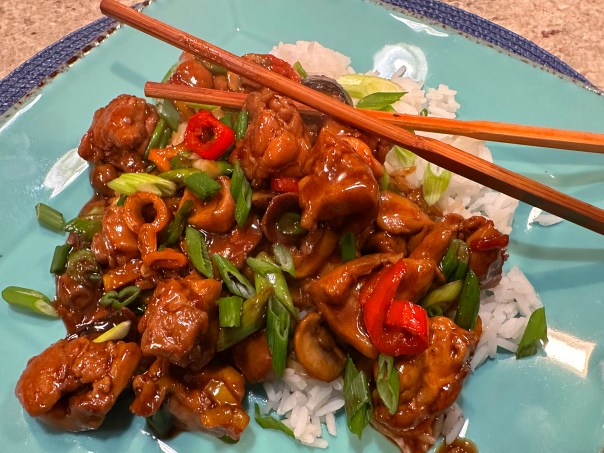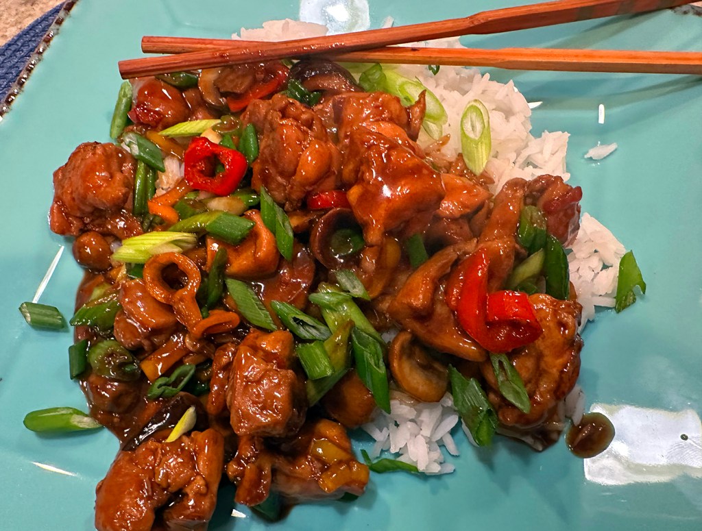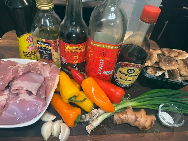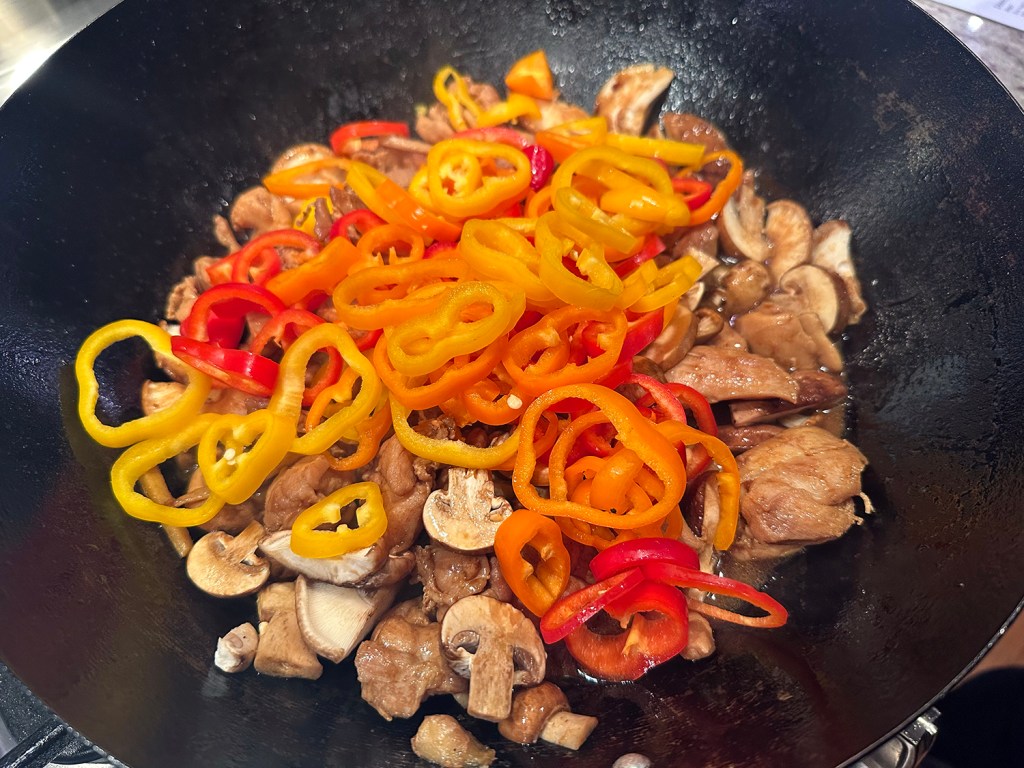 Our changes? We had a frozen packet of chicken thighs that weighed in at 2 1/4 pounds, more than the recipe called for. That fact, plus only 4 ounces of bell pepper just seemed too paltry so we tripled that amount, doubled the scallions, and replaced the water with chicken stock. With all of the “extra” ingredients, we decided to double the sauce ingredients too. Then, at the end, the sauce didn’t seem thick enough so we mixed in a small cornstarch slurry.