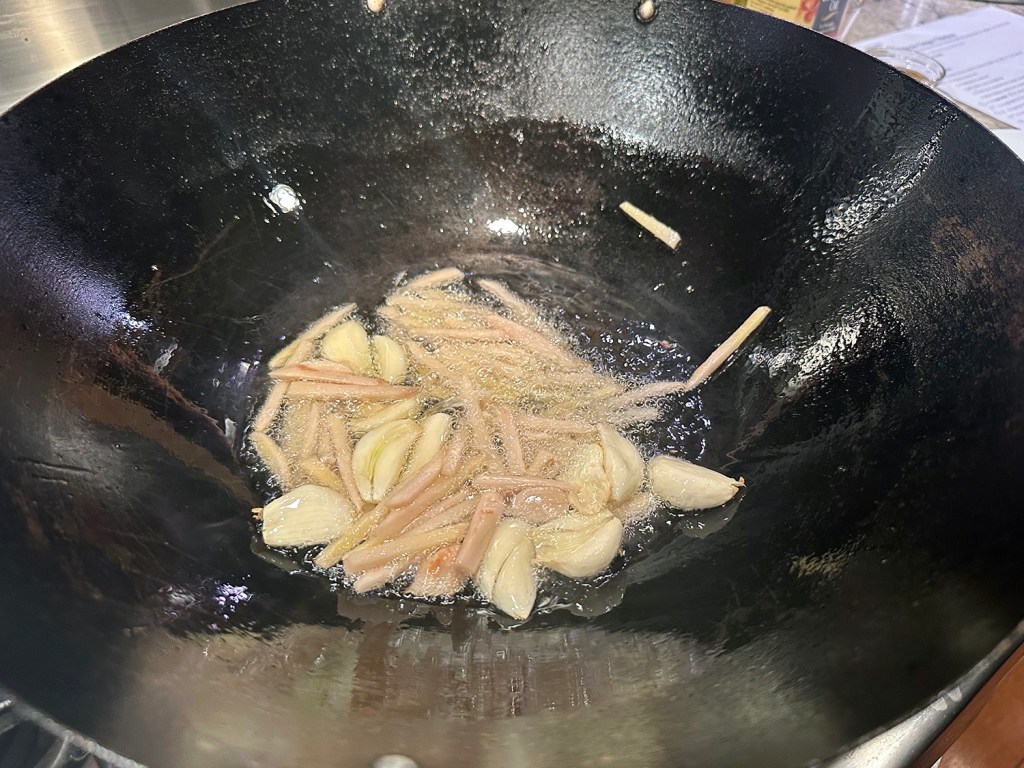 - Toss together chicken and salt in a large bowl; set aside. Heat oil in a wok or large cast iron skillet over medium. Add garlic and ginger; cook, stirring constantly, until fragrant, about 30 seconds. Push garlic and ginger to one side of wok; increase heat to high, and add chicken pieces in a single layer. Cook, undisturbed, until browned in spots, about 2 minutes. Continue cooking, stirring occasionally, until chicken is no longer pink, about 3 minutes.