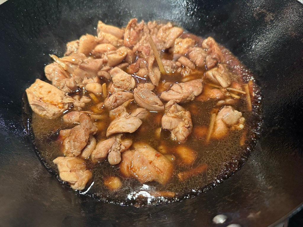 - Stir mushrooms, 2/3 cup chicken stock, Shaoxing wine, soy sauce, dark soy sauce, and sugar into wok. Bring to a boil over high. Reduce heat to medium; cover and simmer vigorously, undisturbed, until a thermometer inserted in the thickest piece of chicken registers 165°F, 5 to 8 minutes.