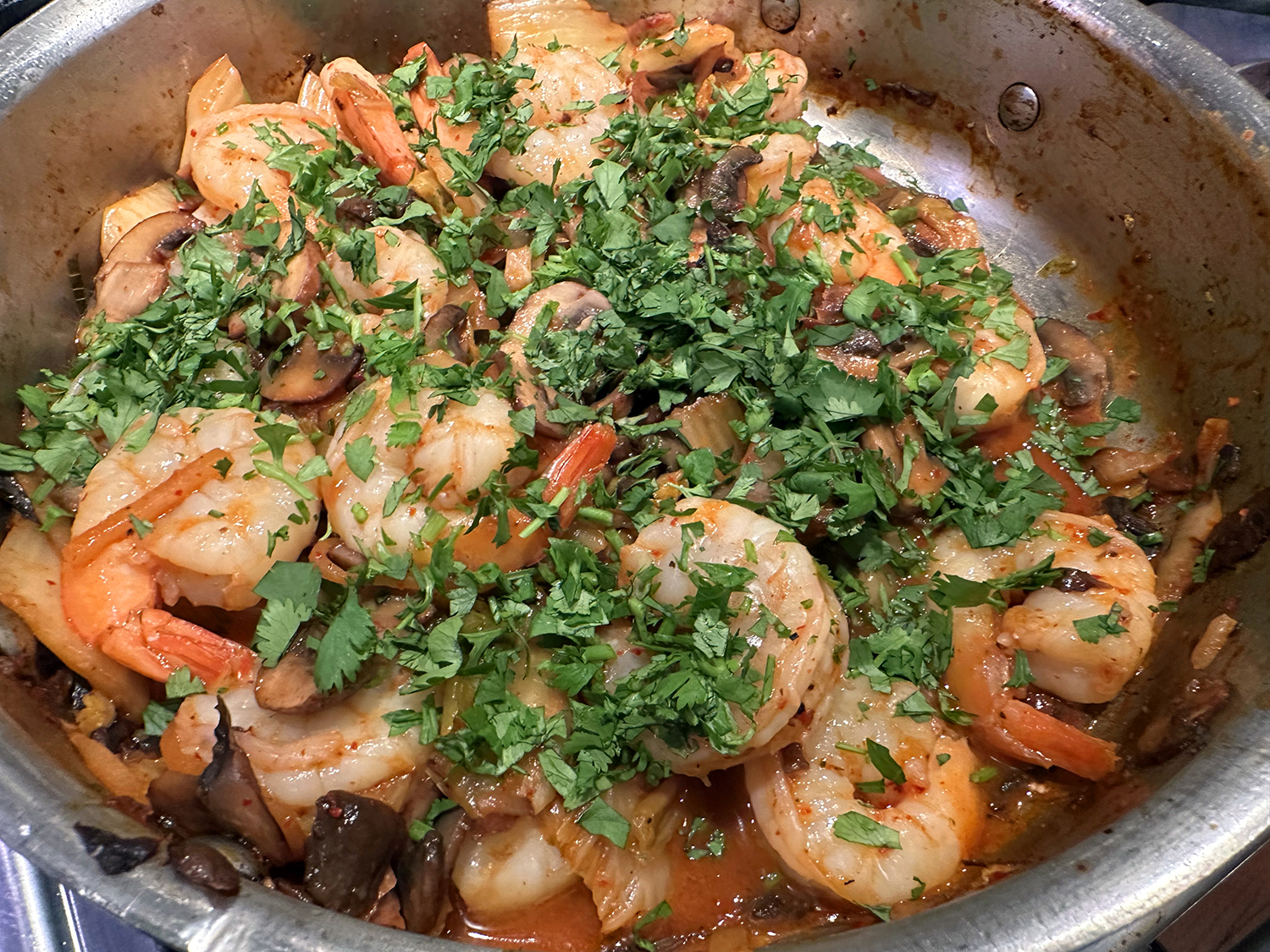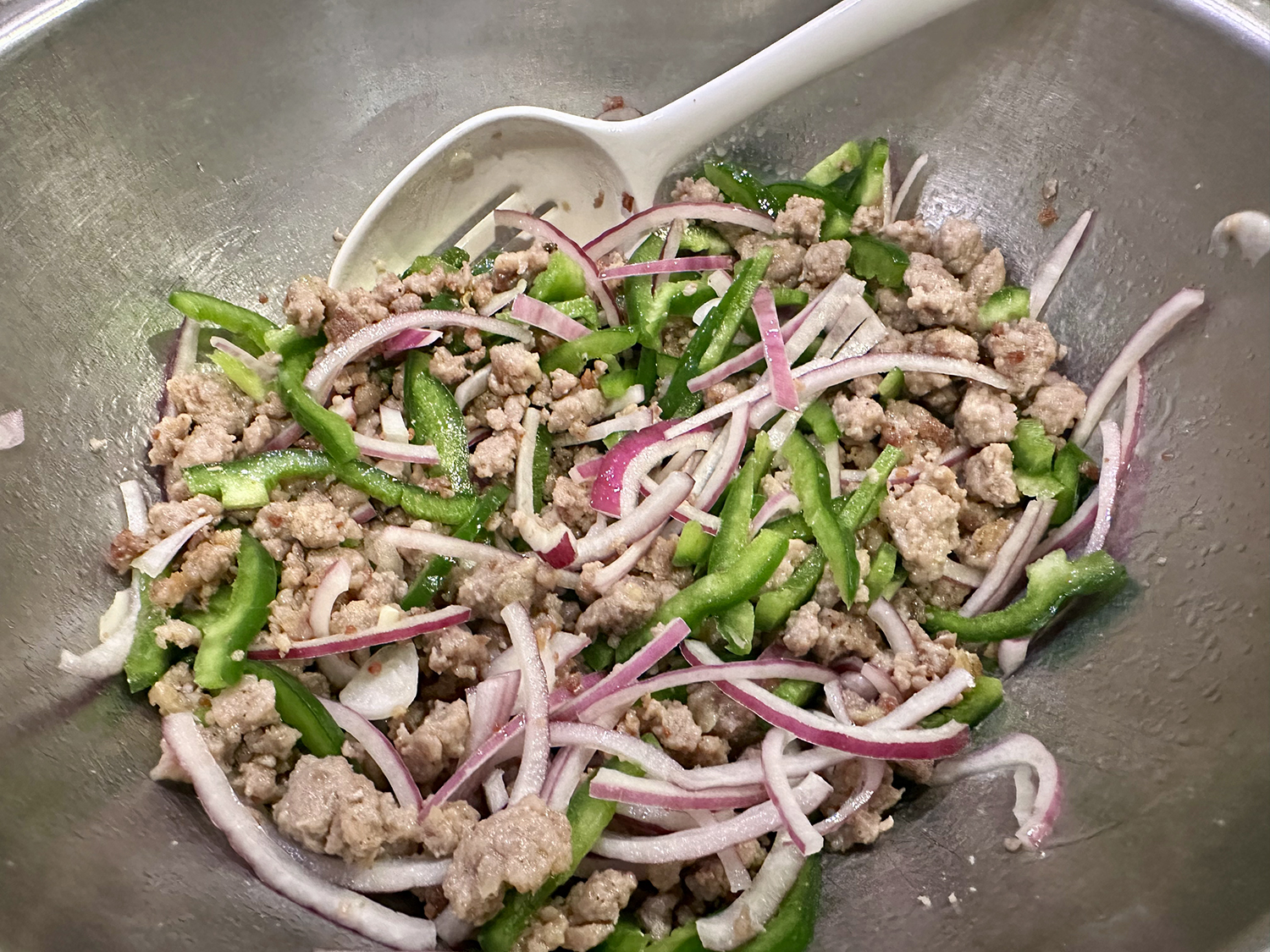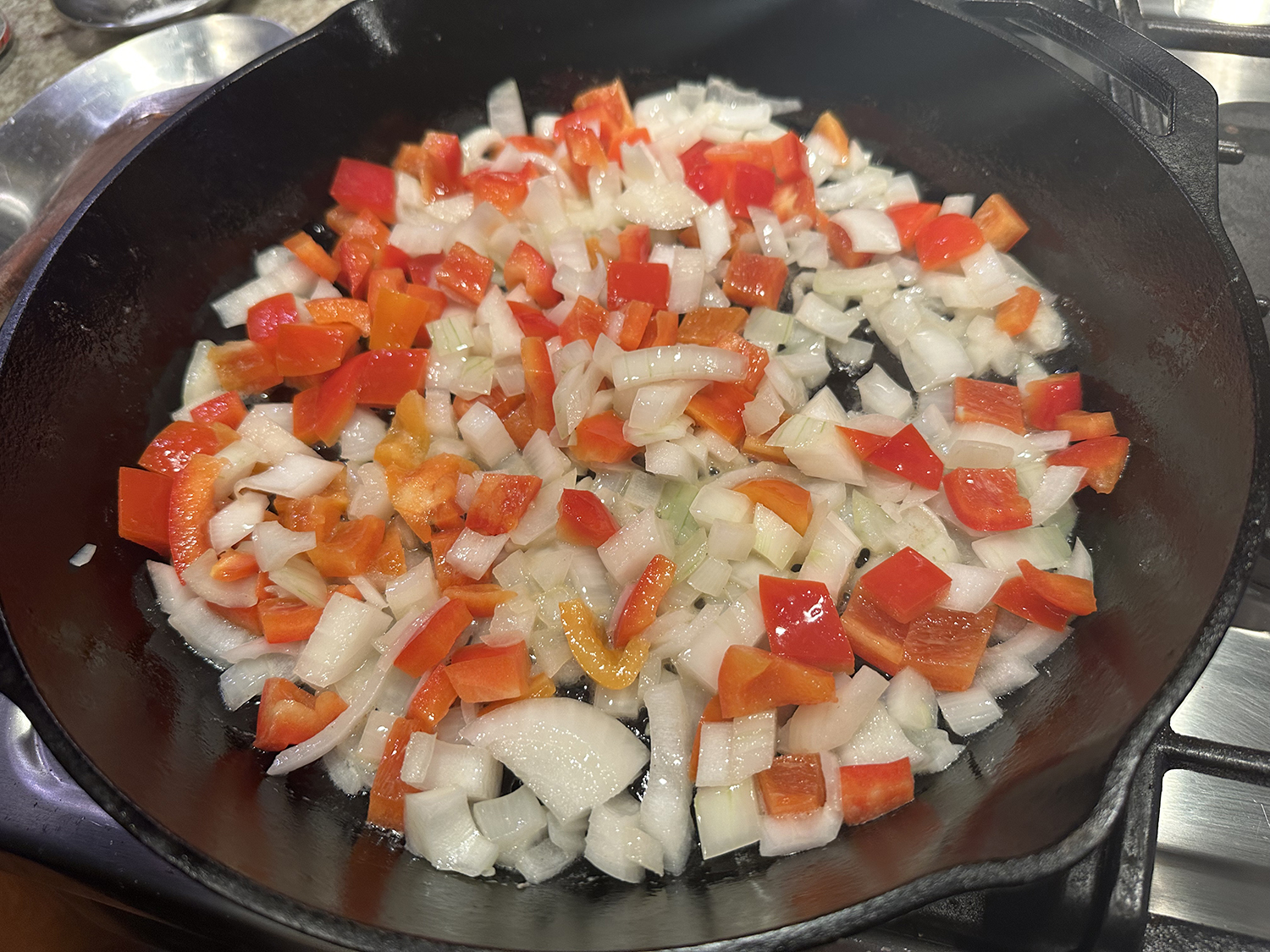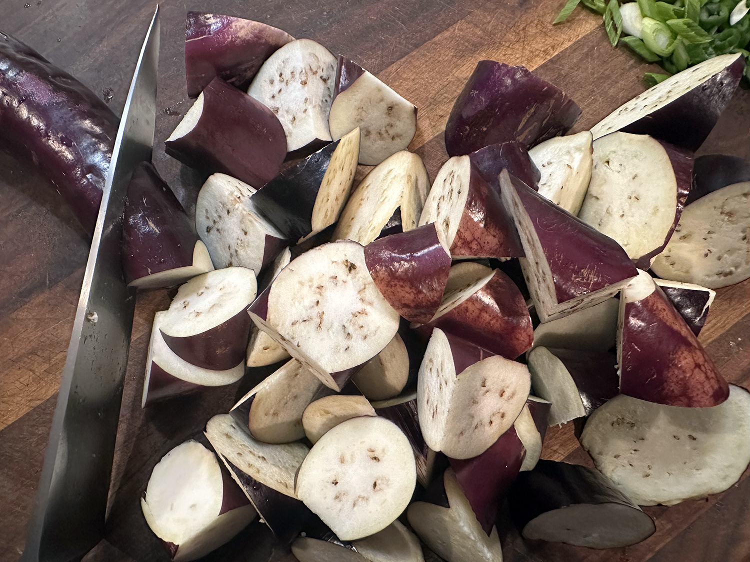 Our changes? We had a frozen packet of chicken thighs that weighed in at 2 1/4 pounds, more than the recipe called for. That fact, plus only 4 ounces of bell pepper just seemed too paltry so we tripled that amount, doubled the scallions, and replaced the water with chicken stock. With all of the “extra” ingredients, we decided to double the sauce ingredients too. Then, at the end, the sauce didn’t seem thick enough so we mixed in a small cornstarch slurry.