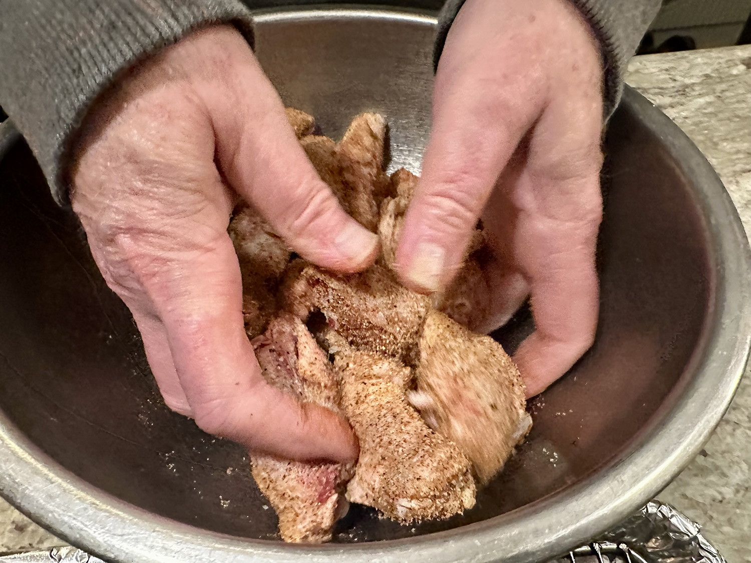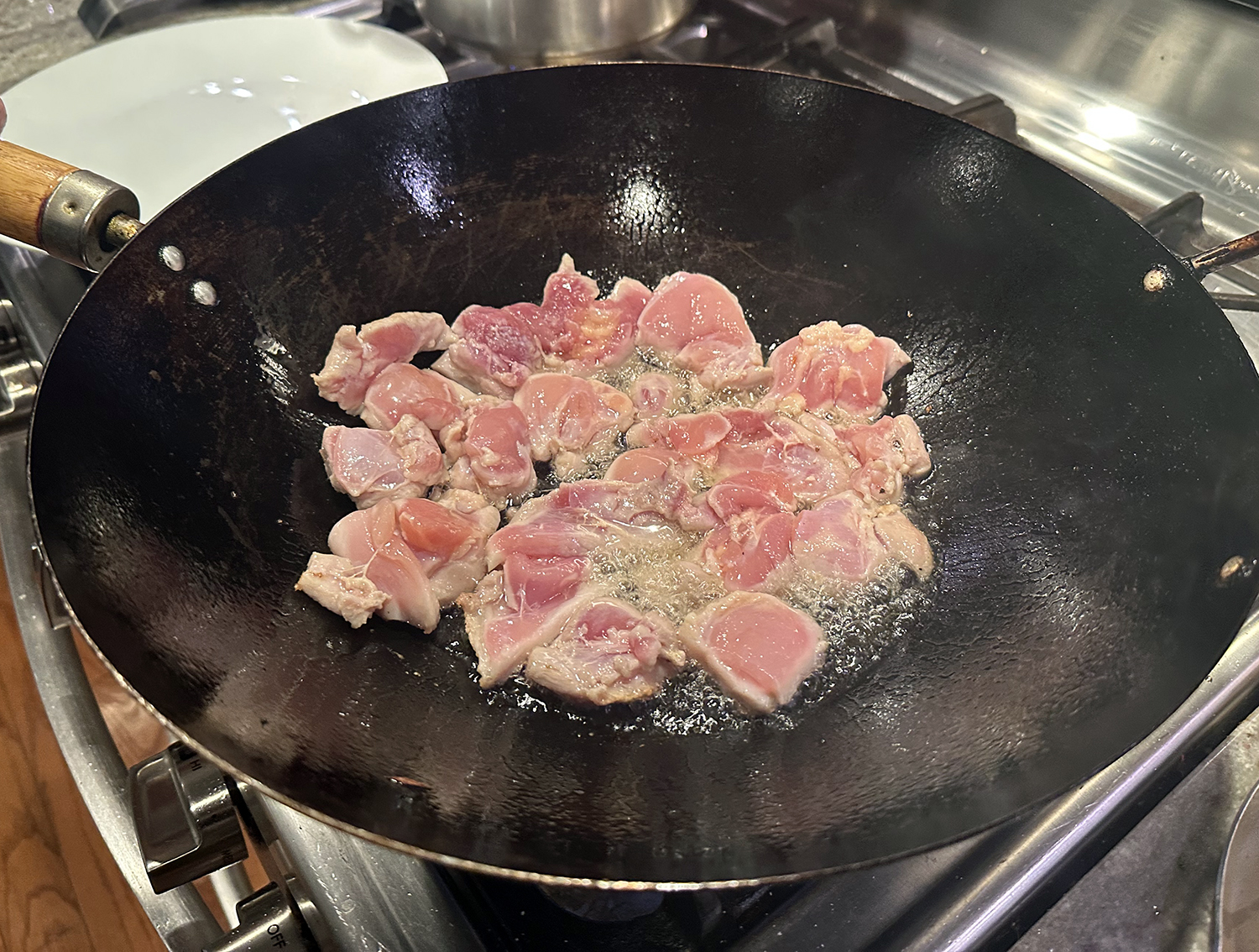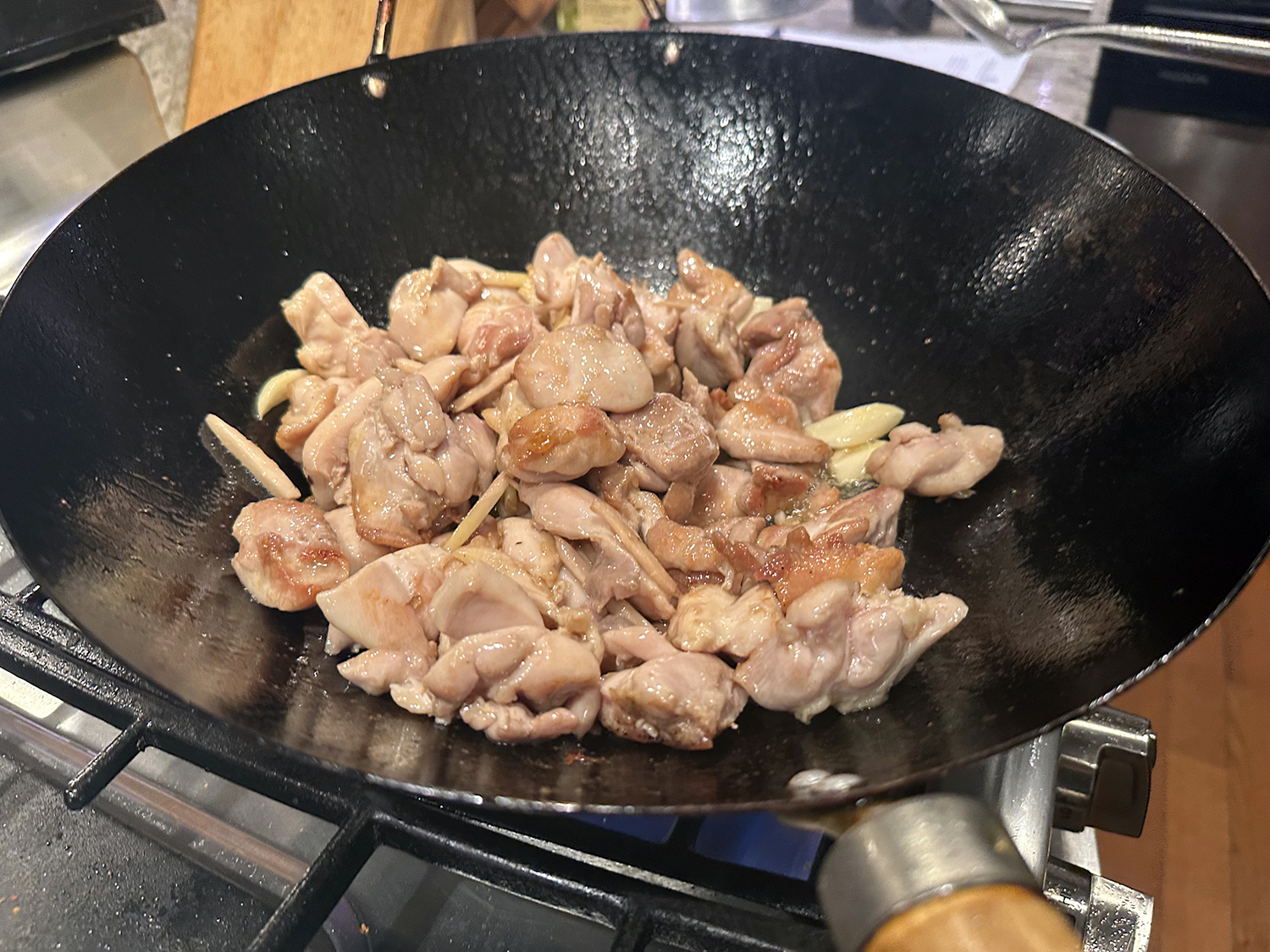 - Toss together chicken and salt in a large bowl; set aside. Heat oil in a wok or large cast iron skillet over medium. Add garlic and ginger; cook, stirring constantly, until fragrant, about 30 seconds. Push garlic and ginger to one side of wok; increase heat to high, and add chicken pieces in a single layer. Cook, undisturbed, until browned in spots, about 2 minutes. Continue cooking, stirring occasionally, until chicken is no longer pink, about 3 minutes.
