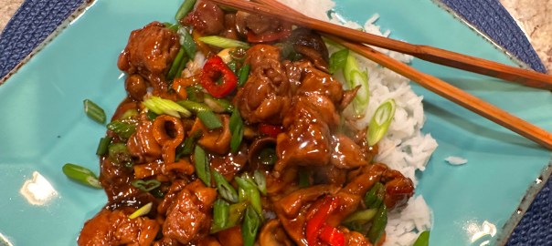 The Hubs decided to stir-fry the ginger and garlic, then instead of pushing them to the side, he removed them to a side plate so as not to burn. Next he stir-fried the chicken in two batches (remember we had more than the instructed amount), and added the ginger and garlic back to the wok with the chicken. While the recipe was very good, it just didn’t contain enough “heat” for us, so next time we’ll add some dried chili peppers to kick it up a notch.