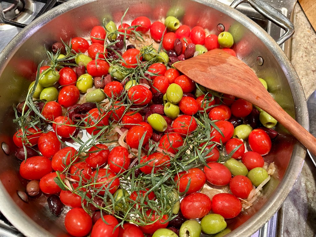 4. Add ⅓ cup of the green olive brine to the skillet and scrape to loosen the brown bits from the bottom of the pan. Add the green olives, Kalamata olives, tomatoes and tarragon. Partly cover with a lid and bring the mixture to a simmer, occasionally stirring and crushing some of the tomatoes with the back of a spoon to release their juices.